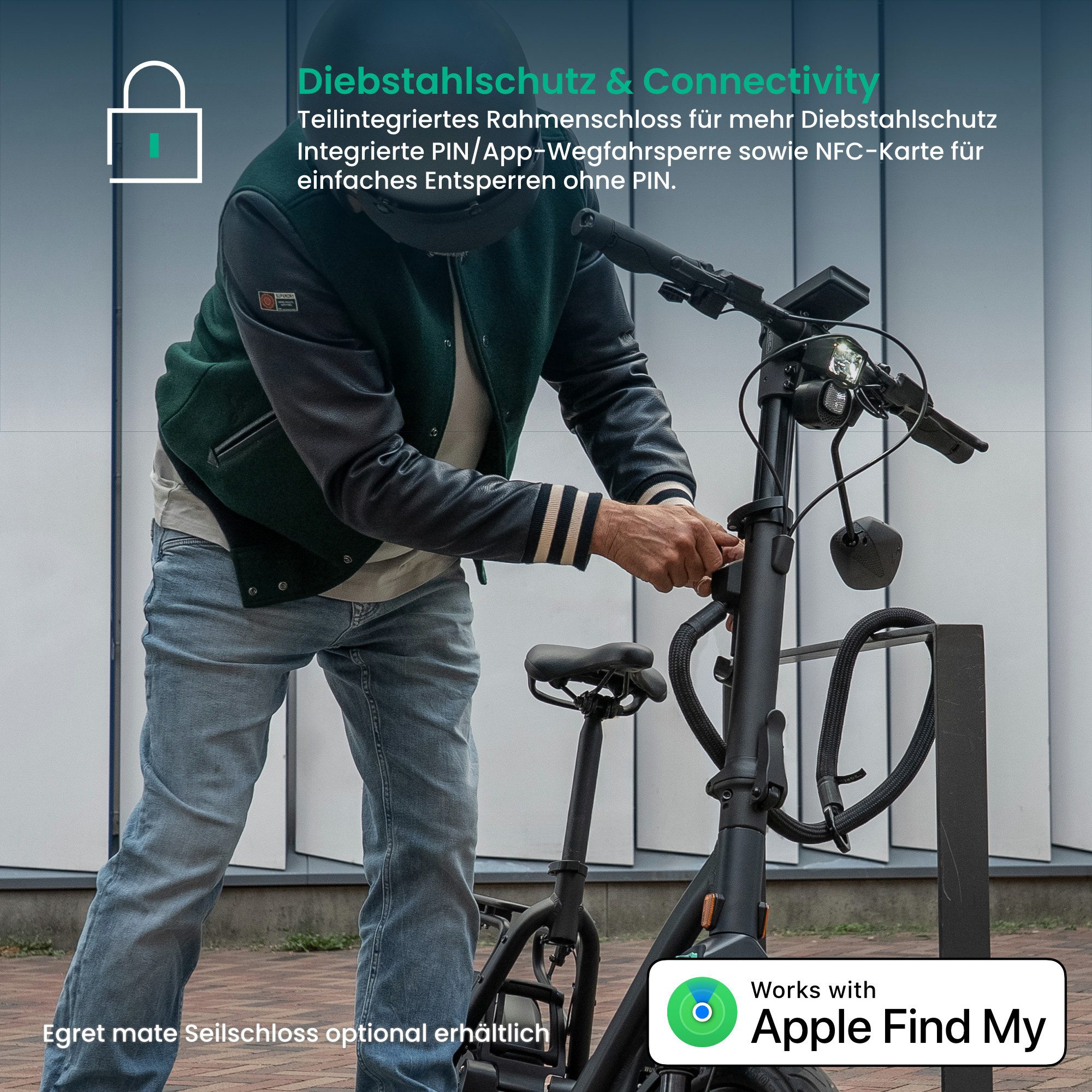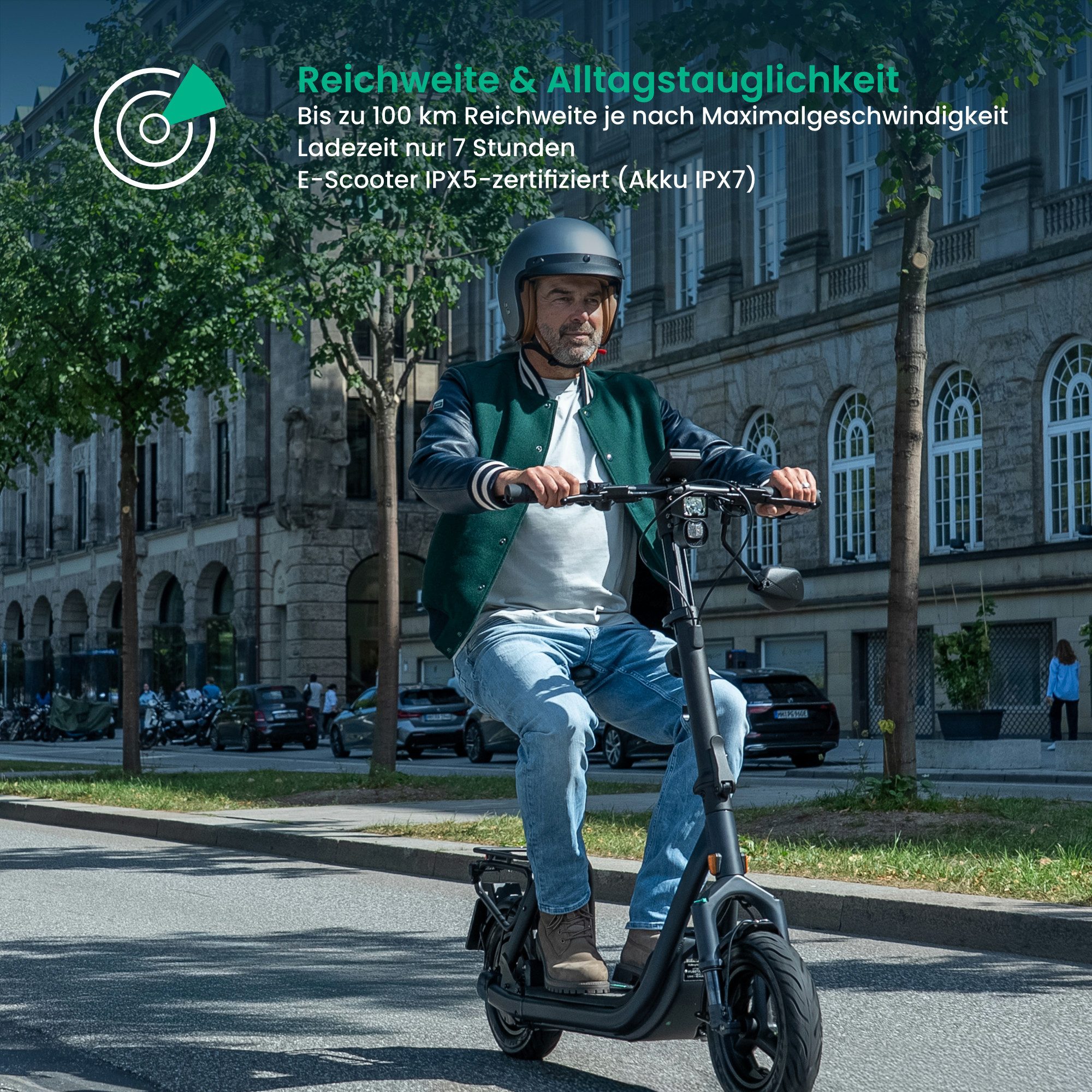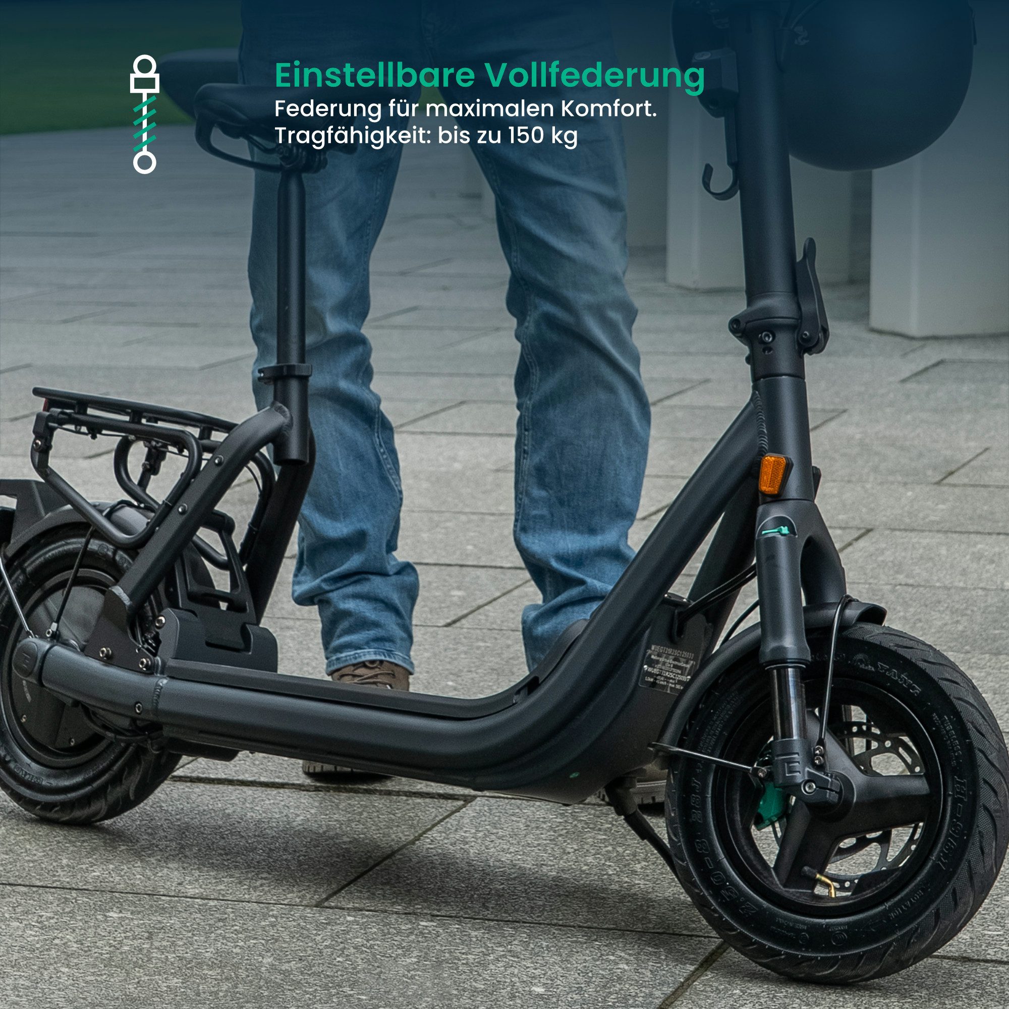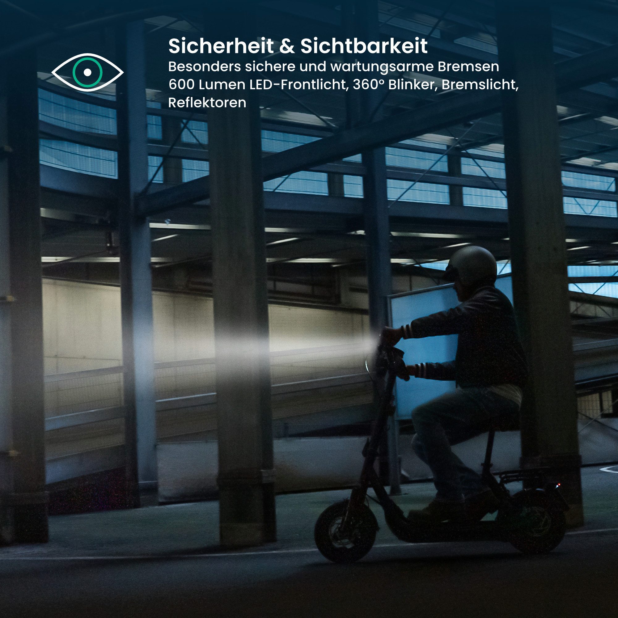 The Egret GTs redefines urban mobility: compact like an e-scooter, fast like a moped, and comfortable like an e-bike. With road approval (L1e), a top speed of up to 45 km/h, and powerful performance, it’s perfect for commuting, leisure, and longer trips outside the city. At its heart is a powerful electric motor with 1,000 W continuous power and up to 1,890 W peak power—typical moped performance, compactly packaged. This allows the GTs to accelerate effortlessly and tackle inclines with ease. Combined with a quick-swap battery system and a capacity of 48 V / 20 Ah (949 Wh), the scooter offers an impressive range of up to 100 km—ideal for daily commutes or weekend getaways. The ride comfort is significantly above average: Large 13″ pneumatic tires with puncture protection, full front and rear suspension—an upside-down fork at the front and an adjustable coilover suspension at the rear—make cobblestones, potholes, or uneven roads no problem. Whether you’re sitting or standing, the GTs rolls smoothly and safely. Conveniently, the GTs is foldable and compact enough to fit in a car or camper van trunk—a real advantage if you want to be flexible on the road. The removable battery also makes charging easy, even when there’s no power outlet nearby. Features and safety are top-notch: Hydraulic 4-piston disc brakes ensure reliable stopping power, while LED lights, turn signals, and an integrated electronic immobilizer offer comfort and security—whether in city traffic or on longer journeys.
