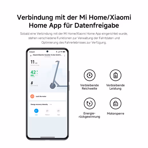 In addition, the Xiaomi Electric Scooter 4 Lite offers the option of accessing real-time data on driving speed and battery level via the Xiaomi Home app. The Kinetic Energy Recovery System (KERS) optimizes battery usage and increases range, so you can travel longer.