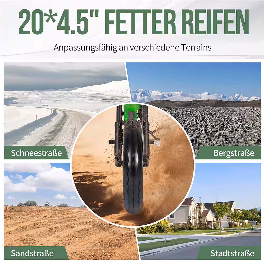 • Wide Chaoyang/Kenda tires: strong grip; 120kg payload for people/luggage; 4.5-5h fast charging + 500 charging cycles – durable and stress-free.