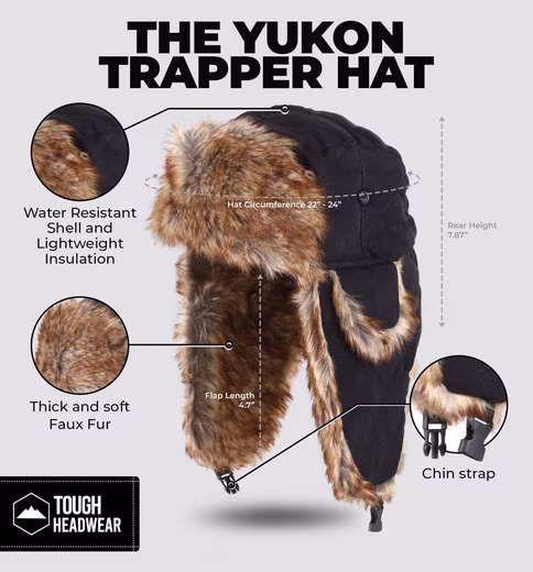 - Warmth for your head and ears: Keep warm in icy weather with our Ushanka trapper hat, lined with faux fur.