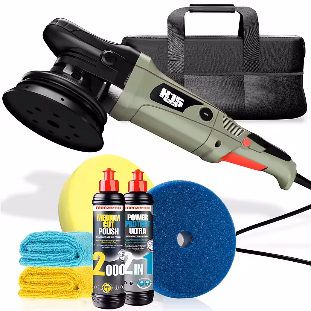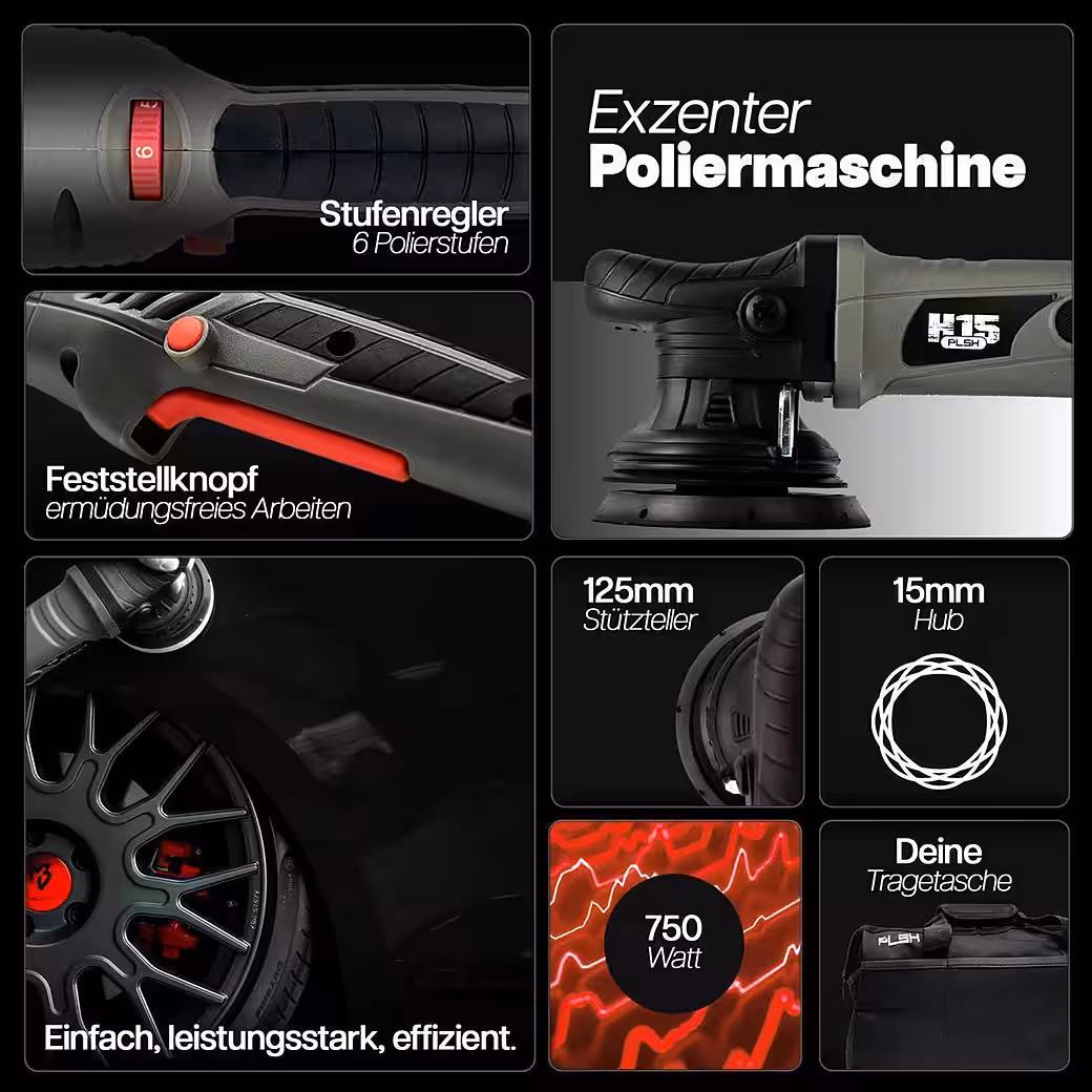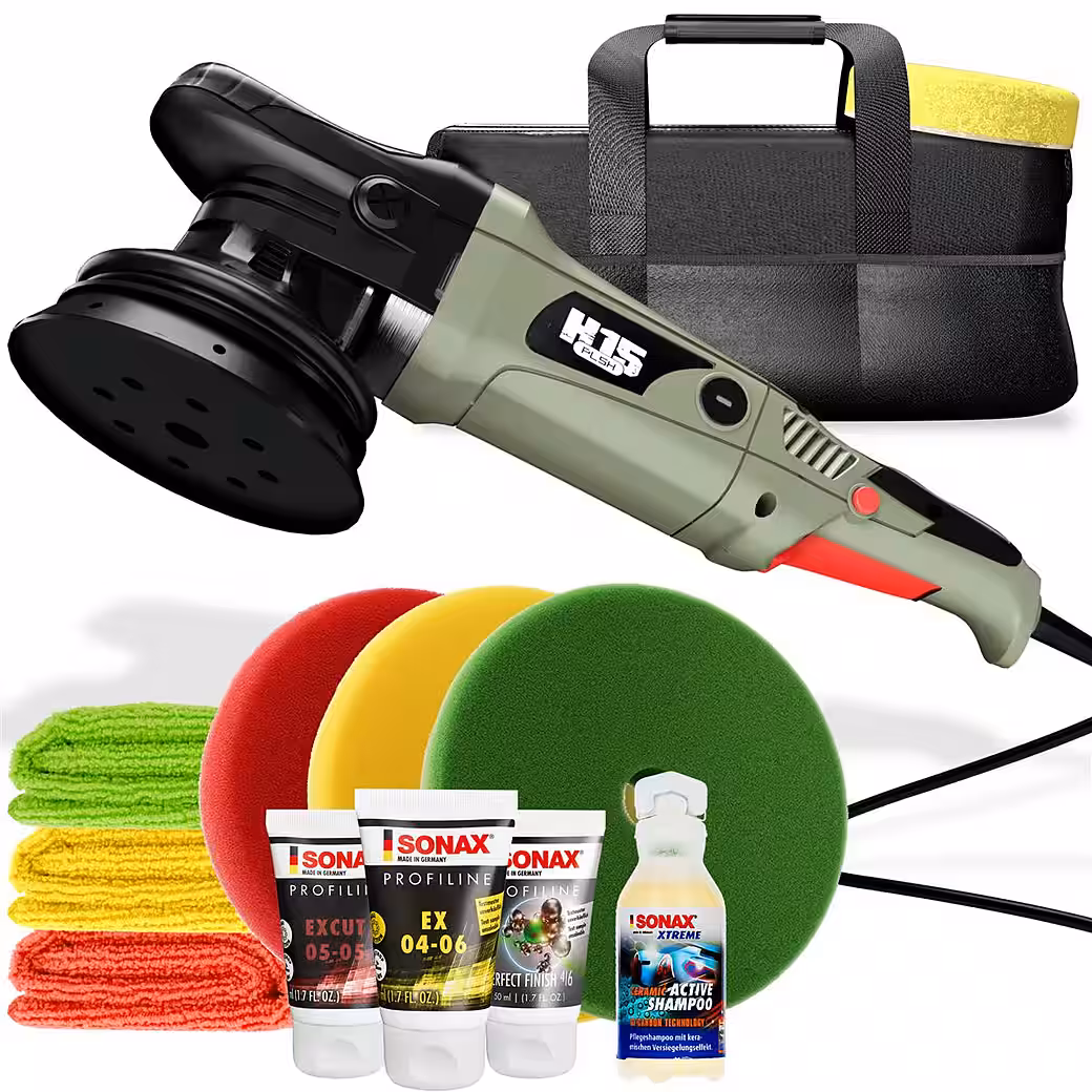 | Scope of delivery | PLSH Eccentric Polisher H15 15mm Stroke, 125mm Backing Plate Sonax Profiline EX 04-06 Polish 50ml Sonax Profiline ExCut 05-05 Polish 50ml Sonax Profiline PerfectFinish Polish 50ml Premium Microfiber Cloth 320 GSM 40x40cm red Premium Microfiber Cloth 320 GSM 40x40cm yellow Premium Microfiber Cloth 320 GSM 40x40cm green Garage Freaks Polishing Pad Heavy Cut Foam Pad – hard, red, 150mm Garage Freaks Polishing Pad Finish Cut Foam Pad – soft, green, 150mm Garage Freaks Polishing Pad Medium Cut Foam Pad – medium, yellow, 150mm |