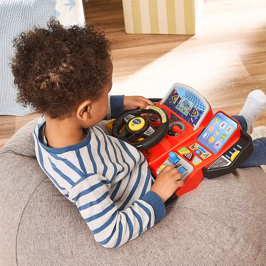 Go on a discovery tour as a driver! Colorful, realistic toy steering wheel with 2.4″ LCD color screen, telephone, horn, gear lever, various content and activities. 3 game modes: – Free driving: on the highway and in the city with traffic basics, including missions (take friends from one place to another, gas station, workshop, market, zoo) – Race: different racing cars and tracks, with different game elements (e.g. obstacles) – Role-play: can be played in the car on the lap while the child pretends to drive in the child seat. Interactive button for navigation, calls, speed control, music, etc. while concentrating on the road. Realistic details to imitate the drivers, e.g. the display turns on when you turn the orange ignition key. The acceleration button accelerates the car in the game. Learning content: numbers, arithmetic, plus and minus, problem solving, alphabet, sounds, colors, animals. 23 melodies. Child-proof battery compartment and automatic shut-off. Demo batteries are included. Required 4 mignon batteries.
