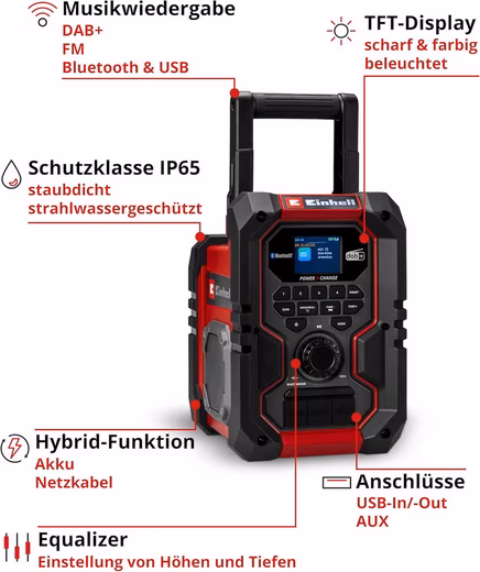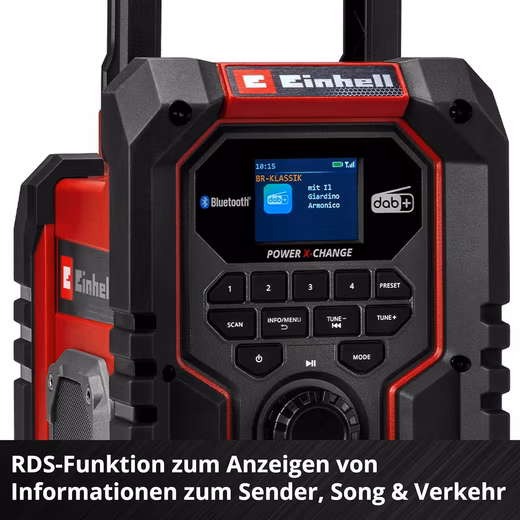 - Construction site radio – The Einhell battery radio receives both DAB+ and FM radio stations. 30 stations can be saved and quick access can be set up.
