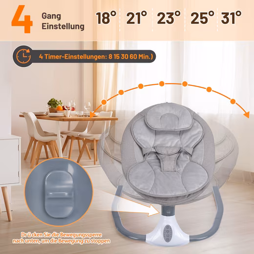 • Electric baby bouncer with timer, 5 rocking speeds and remote control – ideal for helping the baby fall asleep and soothe the baby.