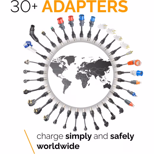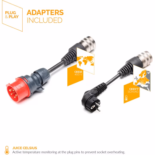 1.4 – 11 kW, 3.1-meter cable. The JUICE BOOSTER 3 air is a mobile wallbox for anywhere. The JUICE BOOSTER 3 air makes the full functionality of smart stationary chargers available regardless of location and is no larger than a soda can. The patented JUICE CONNECTOR plug system recognizes over 30 different adapter plugs and automatically adjusts the charging current accordingly. Thanks to fully automatic adapter recognition, the current is intelligently regulated. The j+ pilot app allows you to control the JUICE BOOSTER 3 air completely, e.g., adjust the power level, track the charging history, and much more, all from the comfort of your sofa. The integrated electricity meter continuously measures consumption during charging and transmits the data to the j+ pilot app in real time. Each individual charging session is permanently stored and listed in detail in the charging history. The Country EU Basic Set also includes two different adapters (CEE16 400 V, Schuko CEE 7/7 DE). The JUICE CONTROLLER control panel, integrated into the Type 2 connector, consists of a button and an RFID reader. Two pre-paired cards are included for RFID activation. Integrated AC and DC fault detection provides protection against electric shocks, and the electronic residual current device (RCD) reliably trips at 30 mA AC and 6 mA DC. This eliminates the need for a costly retrofit of an expensive Type B RCD and enables safe charging even on the go with unknown power supply lines. The mobile charging station is completely dustproof and waterproof (IP67), drive-over resistant with a wheel load of up to 3 tons (IK10), feather-light at only 700g, and compatible with all electric cars equipped with a Type 2 connector.