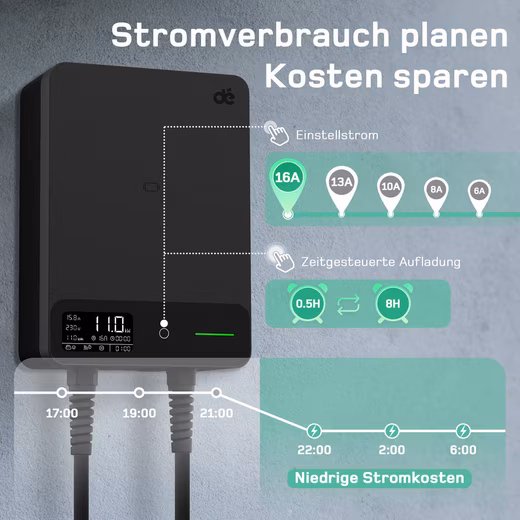 • Tuya app (Android/iOS): Schedules, start/stop, power adjustment, charging history – your dé Wallbox app makes charging transparent and convenient.