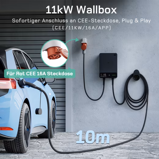 Electric car charging station Type 2 Wallbox 11kW with app and RFID 10m 11kW / 16A, 3, Set, Set, 6-16A 3-phase EV charger 400V efficient charging station for home