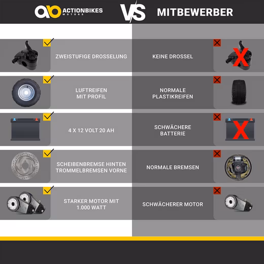 • Safe braking equipment â–º With hydraulic disc brakes at the rear and drum brakes at the front, the electric quad offers reliable control.