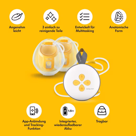 Swing Maxi Hands-free: The Swing Maxi Hands-free electric breast pump offers hands-free pumping for maximum comfort and complete flexibility. The breast pump is compact, features intuitive controls, and is combined with Medela Hands-free collection shells – these are anatomically shaped for effective pumping directly in the bra, ultra-lightweight* for comfortable handling, and easy to clean with just three parts.