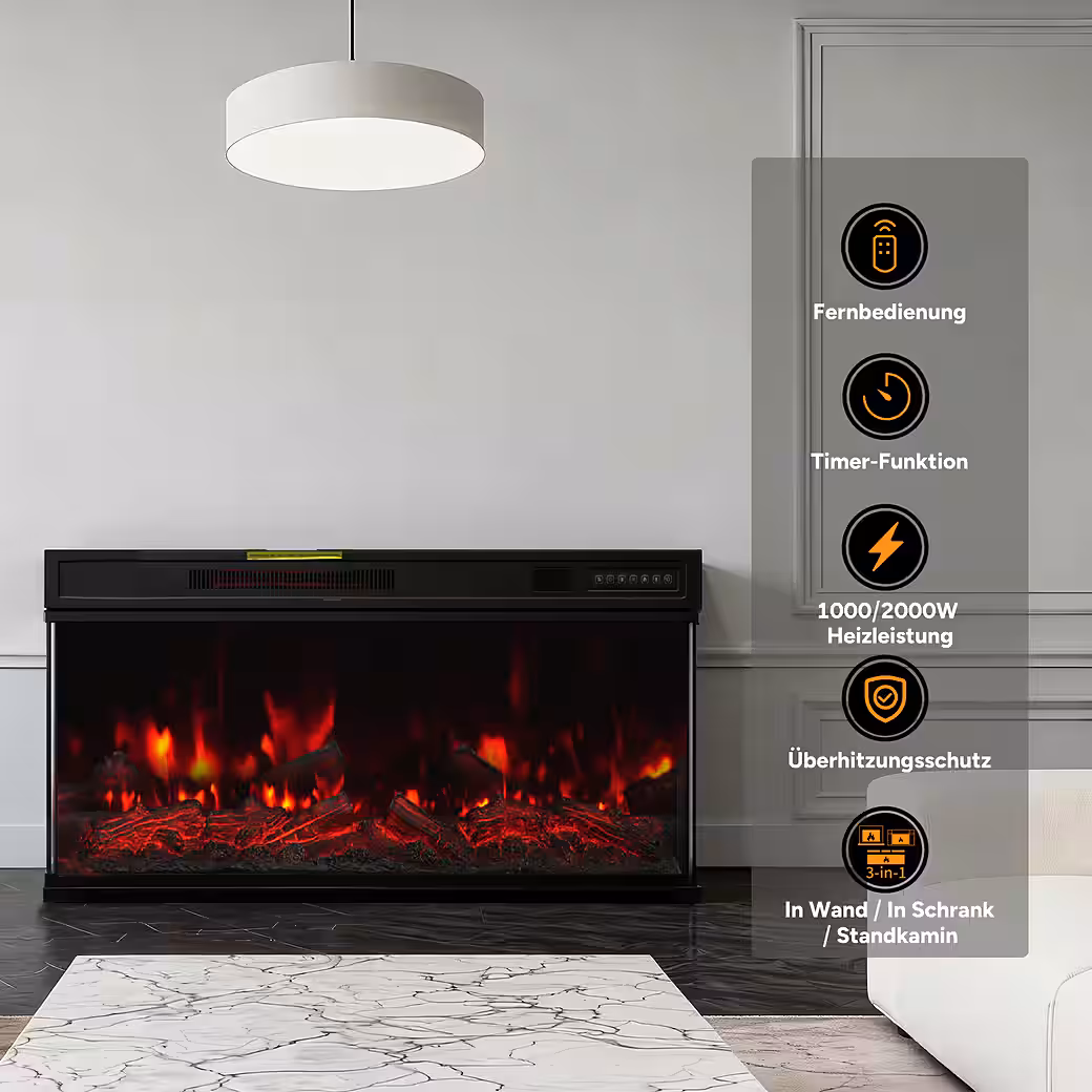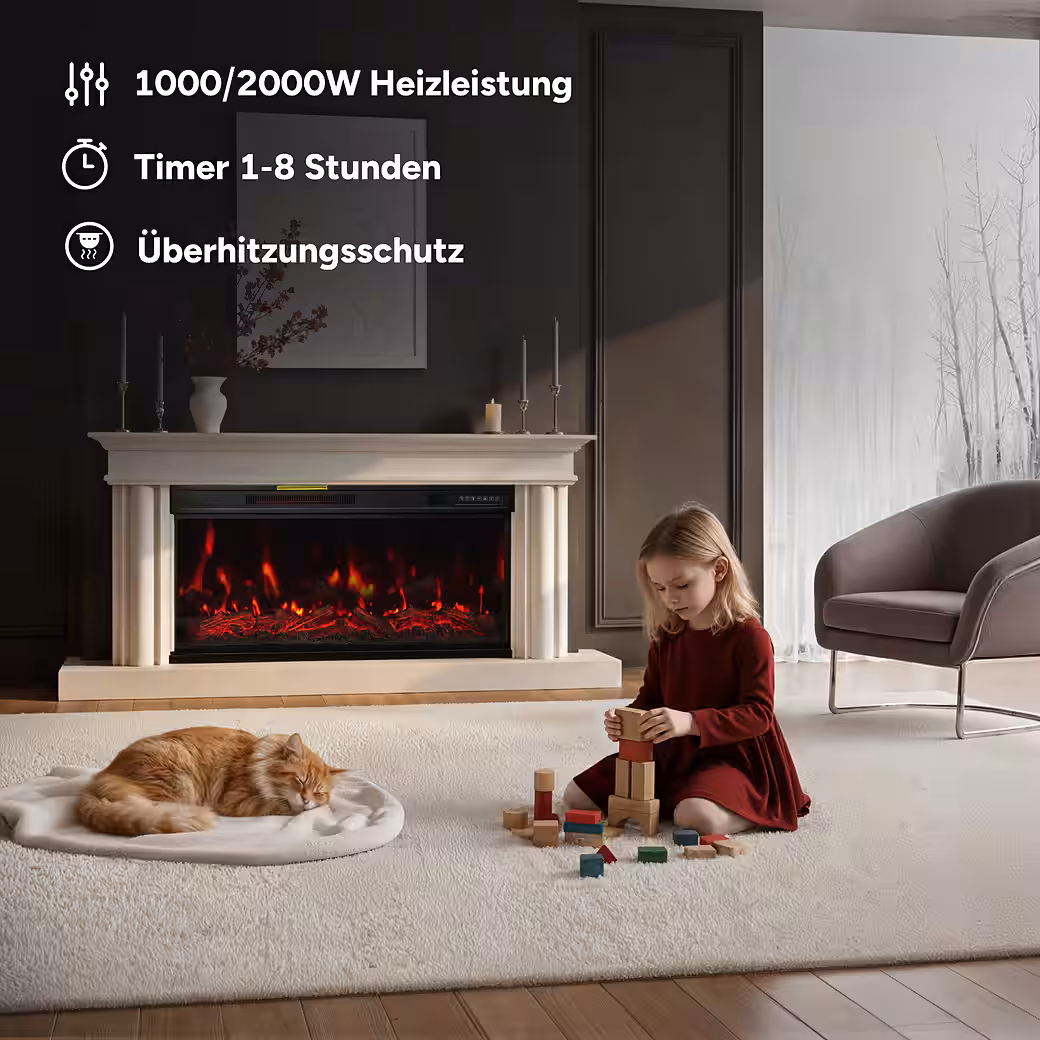 Two-stage heating system – safe and efficient: Both fireplace models feature 1000W/2000W heating stages, individually adjustable to the season or room temperature. With a 1–8 hour timer and overheat protection for safe operation, even at night or during extended use.