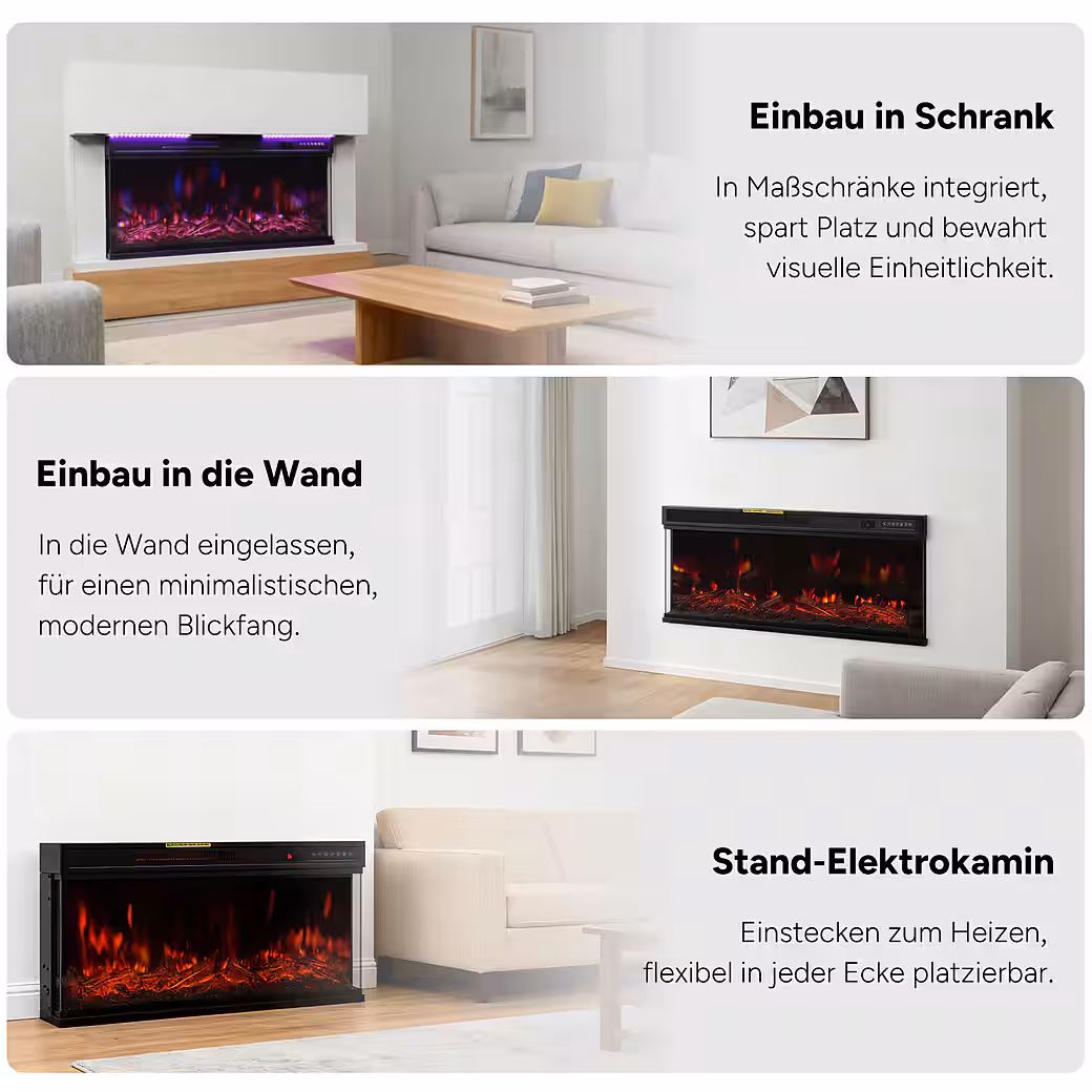 Flexible installation – usable as needed: The 36-inch fireplace can be built-in or freestanding; freestanding without permanent installation, it can be flexibly positioned in the room. The 50-inch fireplace can be built-in or wall-mounted and must be secured, making it ideal for wall or cabinet integration.