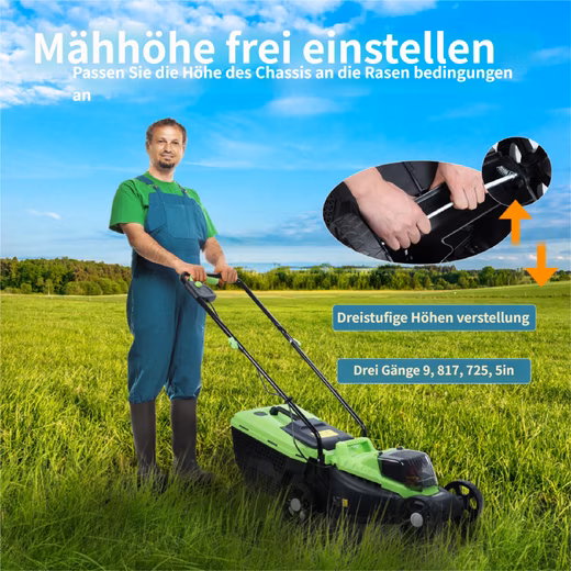 Ergonomic folding handle: Thanks to the ergonomic folding handle, the electric lawn mower can be stored compactly in the middle of the mower. The self-propelled lawn mower has a 3-stage lever and a cutting height adjustment from 25 mm to 65 mm for a perfectly mowed lawn.