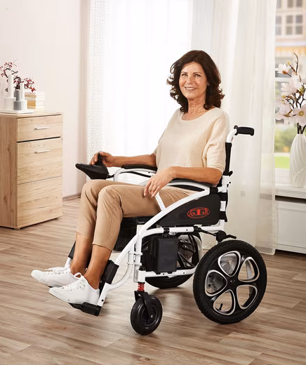 With its small turning radius and simple one-handed controls, this electric wheelchair provides mobility both indoors and outdoors. With a range of up to 20 km, it’s equally suitable for shopping, doctor’s appointments, and leisurely strolls. Another major advantage is its foldable design, allowing you to fold it down to a very compact size when not in use and store it away easily. This makes it an ideal solution for smaller apartments and for travel.