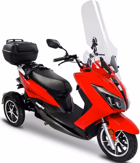 The modern and stylish MAXIMUS MX3-25 3-wheeled e-scooter is approved for two-up riding. This electric scooter has EU road approval and is therefore legal for use on public roads. With seatbelts fastened, the rider and passenger are exempt from helmet requirements. The extra-large windshield protects against wind, insects, and other objects that might hit the vehicle while riding. Thanks to its powerful 1500-watt electric motor and 60-volt operating voltage, the MAXIMUS quickly reaches its maximum speed of 25 km/h. It offers three speed settings: 10, 15, or 25 km/h, depending on traffic conditions. The included 60V-32.5Ah lithium battery can be charged both internally (in the vehicle) and externally. The battery is removable, portable, and can be charged at any standard 230V household outlet. A single charge provides a range of approximately 70 km. Front and rear suspension guarantee a comfortable ride, no matter where you’re going or how uneven the road is. The telescopic fork at the front and the two rear shock absorbers absorb bumps on uneven surfaces and reduce vibrations. The Maximus MX3-25 is equipped with a front disc brake and two rear drum brakes to ensure safe and reliable braking performance. The large, multifunctional digital display shows all essential information. The LED headlights offer excellent illumination, are durable, and energy-efficient. The phone mount allows you to attach your mobile phone to the handlebars. A USB charging port lets you recharge your phone anytime. Other useful extras, such as a remote-controlled alarm system and a trailer hitch, are also included. The lockable, spacious top case provides additional storage space.