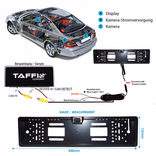 • EU car license plate holder, front/rear view camera with distance indicator