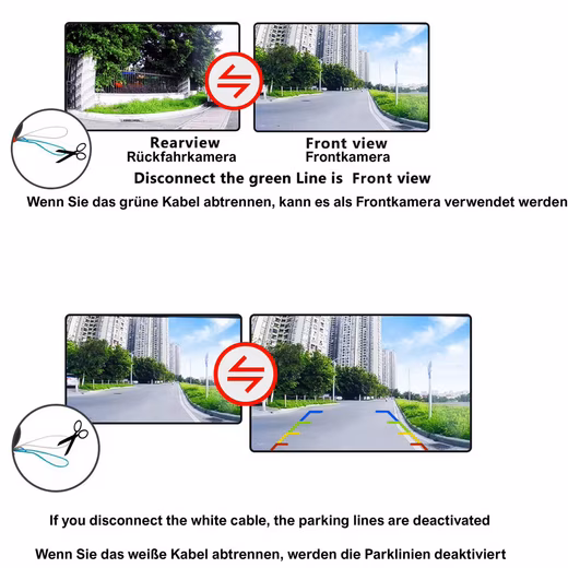 Caution! The camera is set up as a front camera. If you wish to use it as a reversing camera, please cut the thin white wire on the power cable.