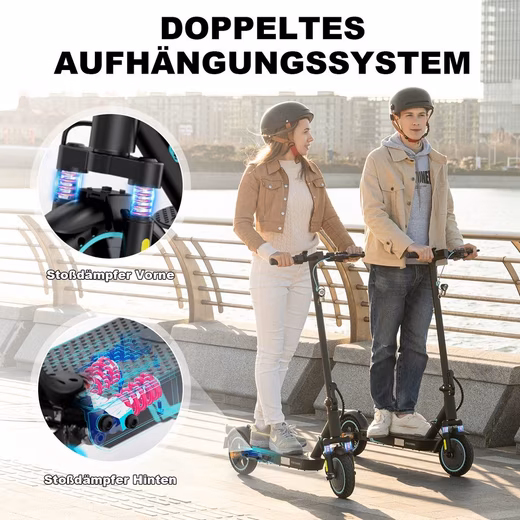 Convenient Riding Experience: The e-scooter has a dual suspension system for comfortable shock absorption, which allows for easy travel. In addition, it offers dual brakes as well as headlights and taillights to accompany your travels.