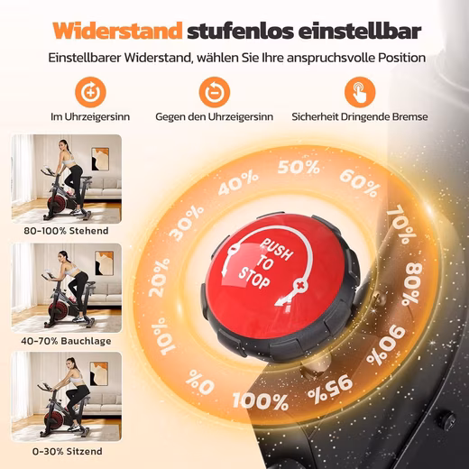 - Braking system: A felt-covered metal plate is pressed against the flywheel, increasing brake pressure and therefore resistance by turning a button.