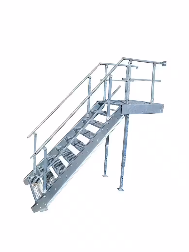 These steel stringer stairs with landings are ideal for outdoor use.