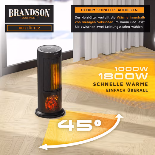 • Brandson Ceramic Fan Heater 1800 W | PTC Heating Elements for Fast Heat | Switchable Fireplace Comfort Indicator | Stylish Heat Source for Living Room | Office | Bedroom