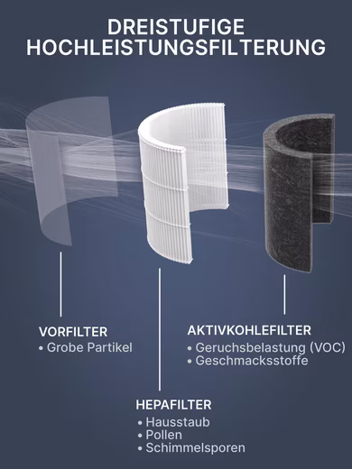 - HEPA element : Reliably filters the finest particles such as pollen, house dust and mold spores from the room air.