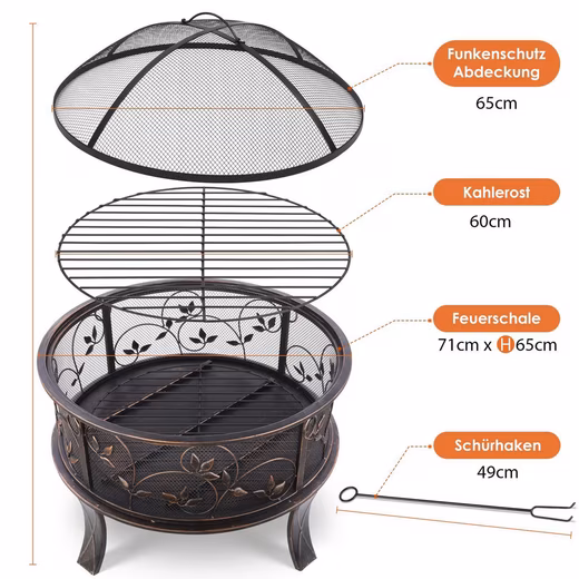The fire pit measures Ø 71 x 65 cm. The four thickened support legs are very sturdy. The fire basket is equipped with four lifting straps for easy transport. Ideal for gardens, beaches, patios, rooftops, and camping.
