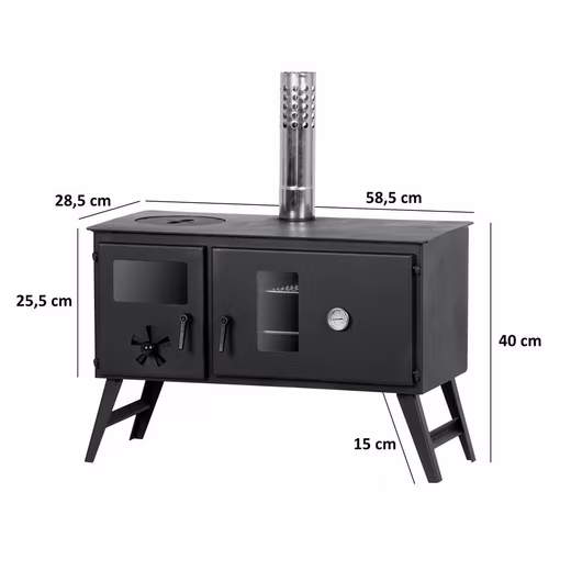 – Scope of delivery: 1x tent stove (as pictured), 7x flue pipes, 1x Spark protection tube, 1x baking tray, 1x wire rack, 1x assembly instructions