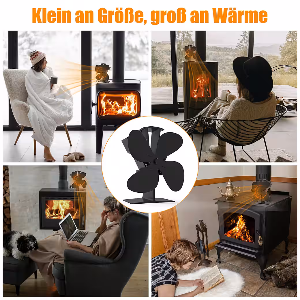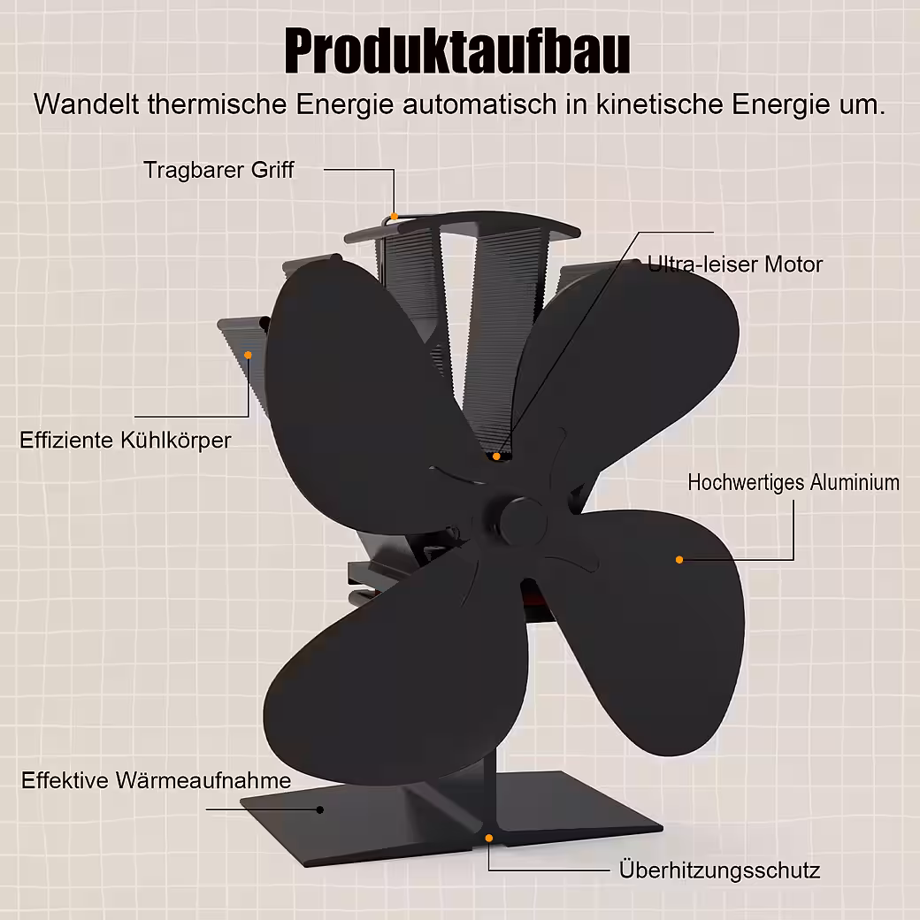 No electrical connection required – the fan is driven by heat. The blades begin to rotate at 50°C, with the speed increasing as the temperature rises. The operating range is between 50°C and 345°C.