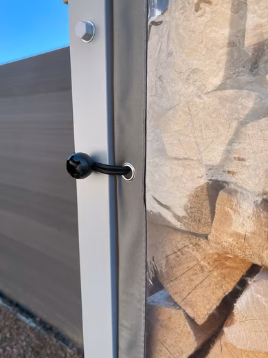 The weather protection is simply attached to the frame of the shelf with fastening rubbers. 22 eyelets and rubbers provide a firm hold against wind.