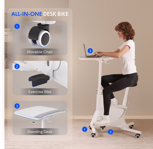 Desk, exercise bike & chair This innovative desk bike combines movable chairs, exercise bikes and height-adjustable desk in a compact device – ideal for active work in the office or at home.