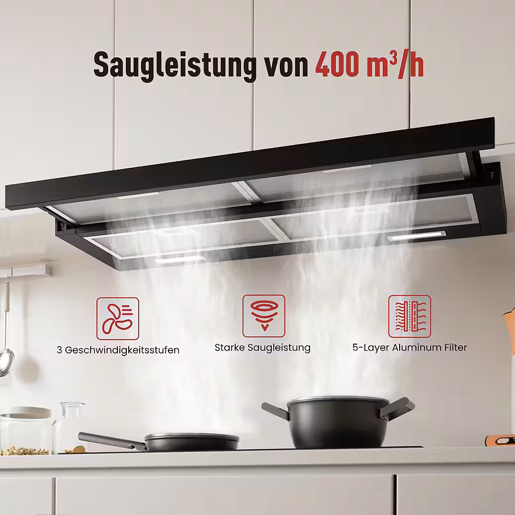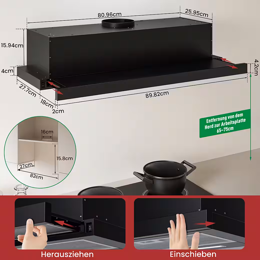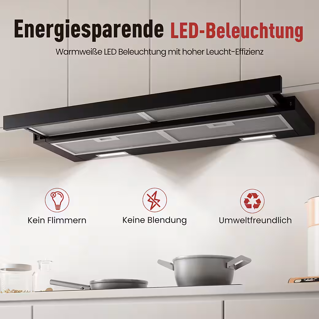 - COMPACT AND MODERN | With dimensions of 90 (L) x 29.7 (W) x 20 (H) cm, the extendable flat screen hood integrates stylishly into your kitchen.
