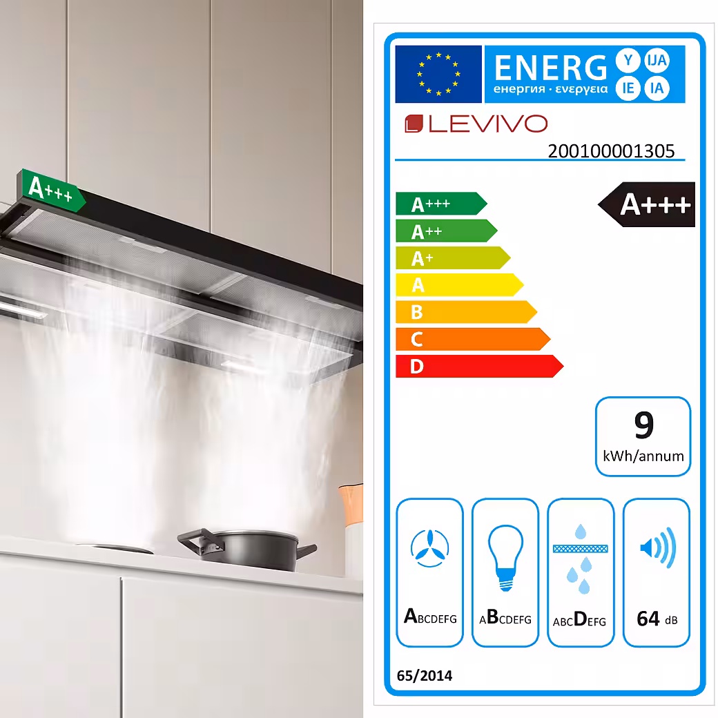 - ENERGY EFFICIENT AND QUIET | With energy efficiency class A+++ (9 kWh/year), the Levivo extractor hood protects the environment and your wallet. Operating noise level of max. 64dB