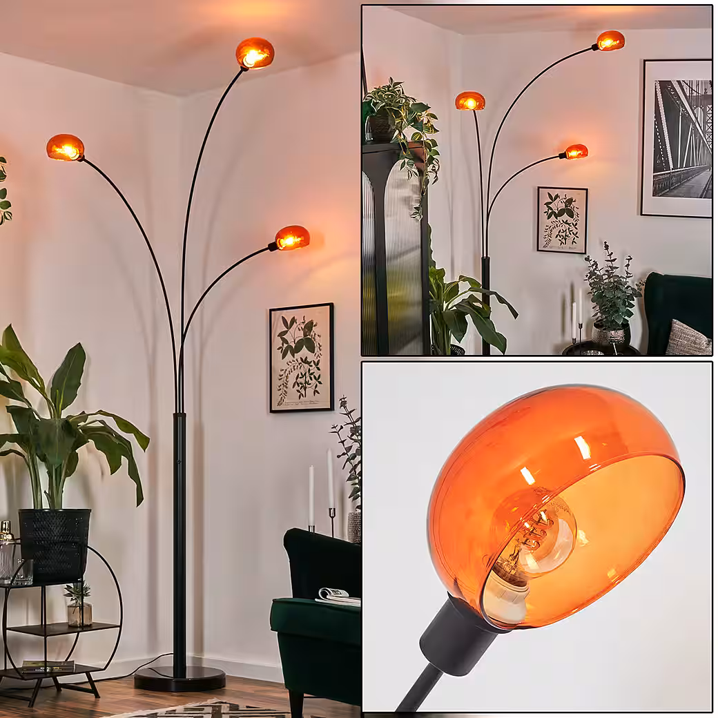 • Three individually tiltable and rotatable glass light arms in warm orange create flexible lighting accents, ideal for cozy reading evenings in the living room.