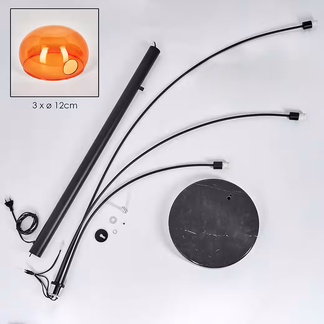 • The “Suio” floor lamp embodies a striking retro vibe with its black and orange metal look, three adjustable glass light heads and solid 35cm marble base.