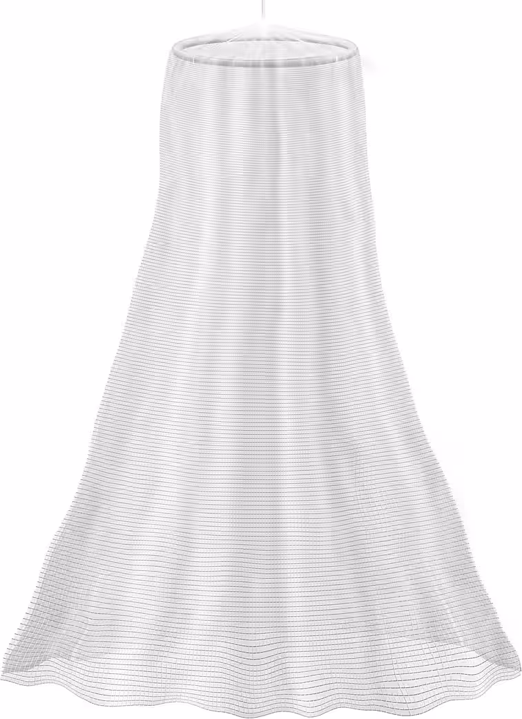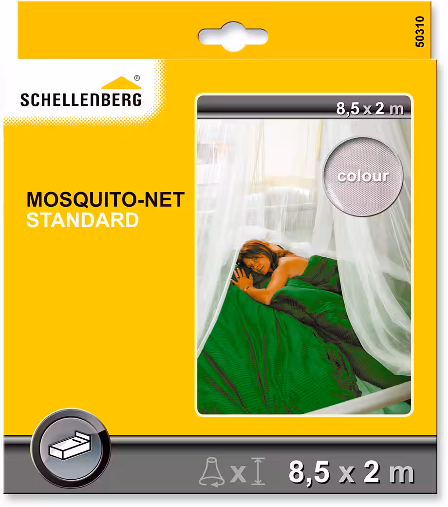 The STANDARD mosquito net protects you from mosquitoes, flies, and other insects while you sleep. With a height of 2 meters and a circumference of 8.5 meters, it is ideal for single beds, children’s beds, or cribs. The metal ring integrated into the upper part of the fabric gives the mosquito net its round shape. The lightweight white polyester fabric is UV-resistant and washable up to 30°C if soiled. The mosquito net is mounted to the ceiling above the bed using a screw hook. Screw hooks and wall plugs are included.