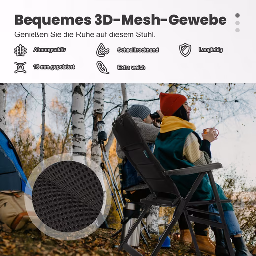 The 6-position adjustable backrest allows you to adjust your sitting position to your liking, while the 3D mesh seat fabric provides optimal breathability and softness. The additional 15 mm padding provides a soft, supportive seating experience. This foldable garden chair is ideal for motorhome trips, camping trips, beach holidays and more.
