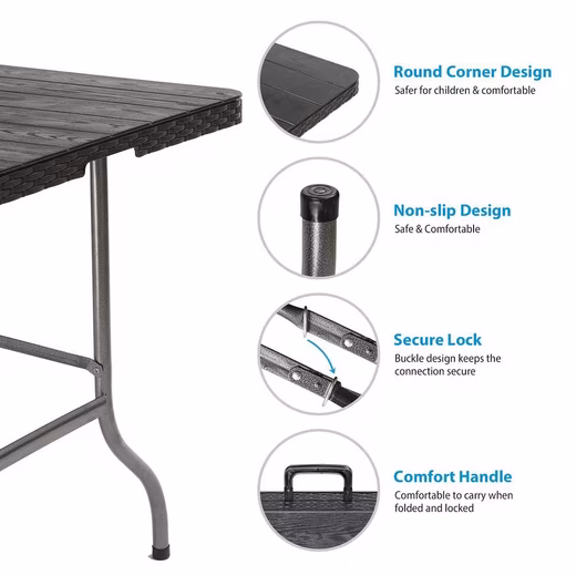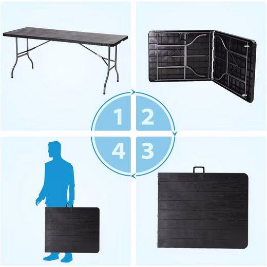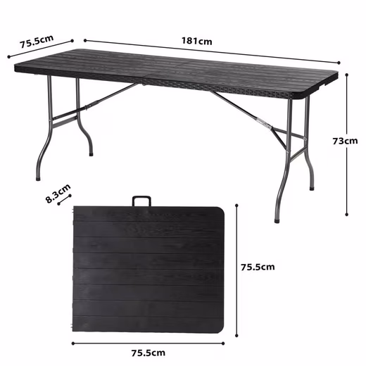 - Versatile dining room table: This 180 cm folding table with dimensions of 181×75.5×73 cm offers enough space for up to 8 people. Perfect for camping or outdoor dining.