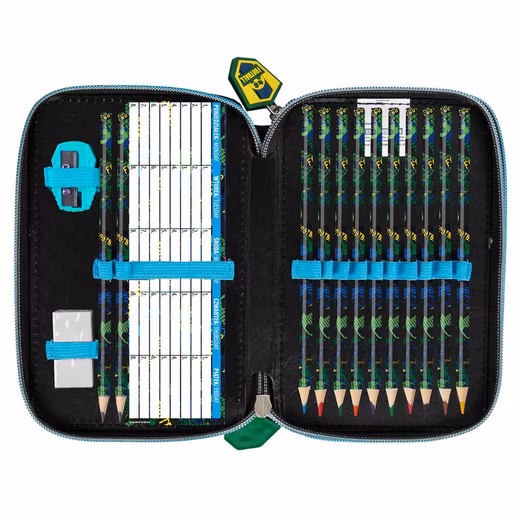10 colored pencils, 10 felt-tip pens, 1 eraser, 1 pencil sharpener, 1 ruler (15 cm), 1 notepad and 2 pencils.
