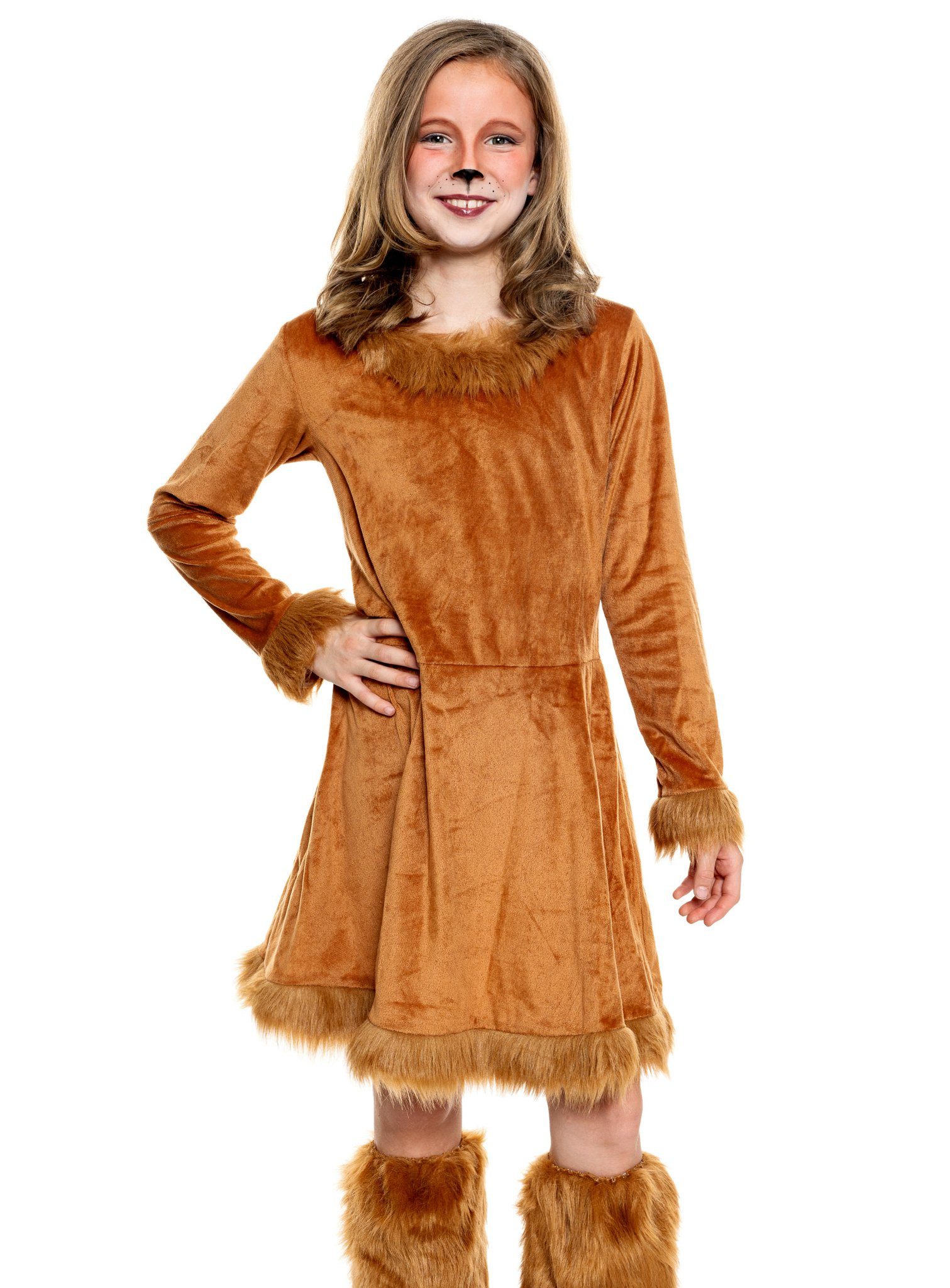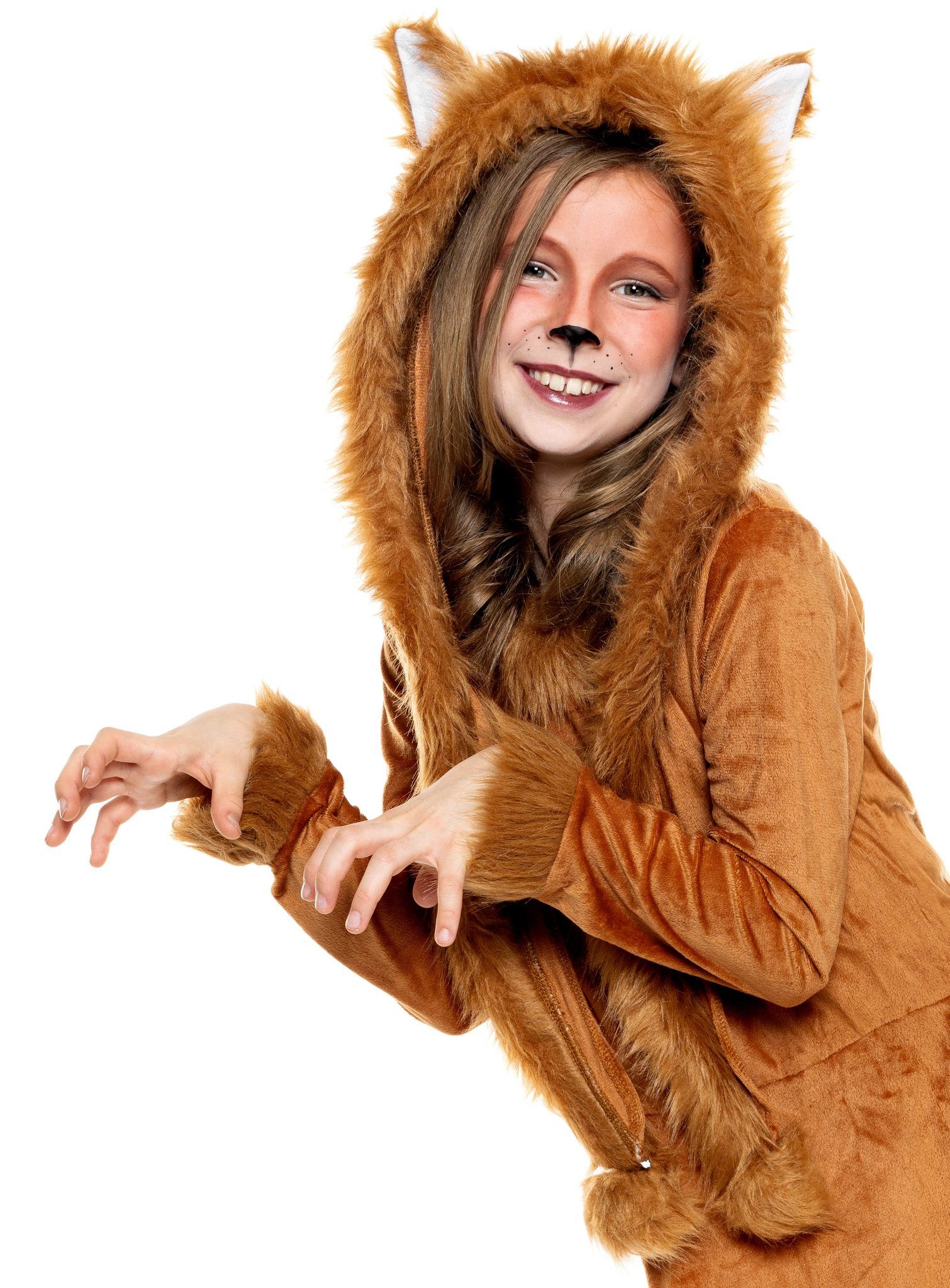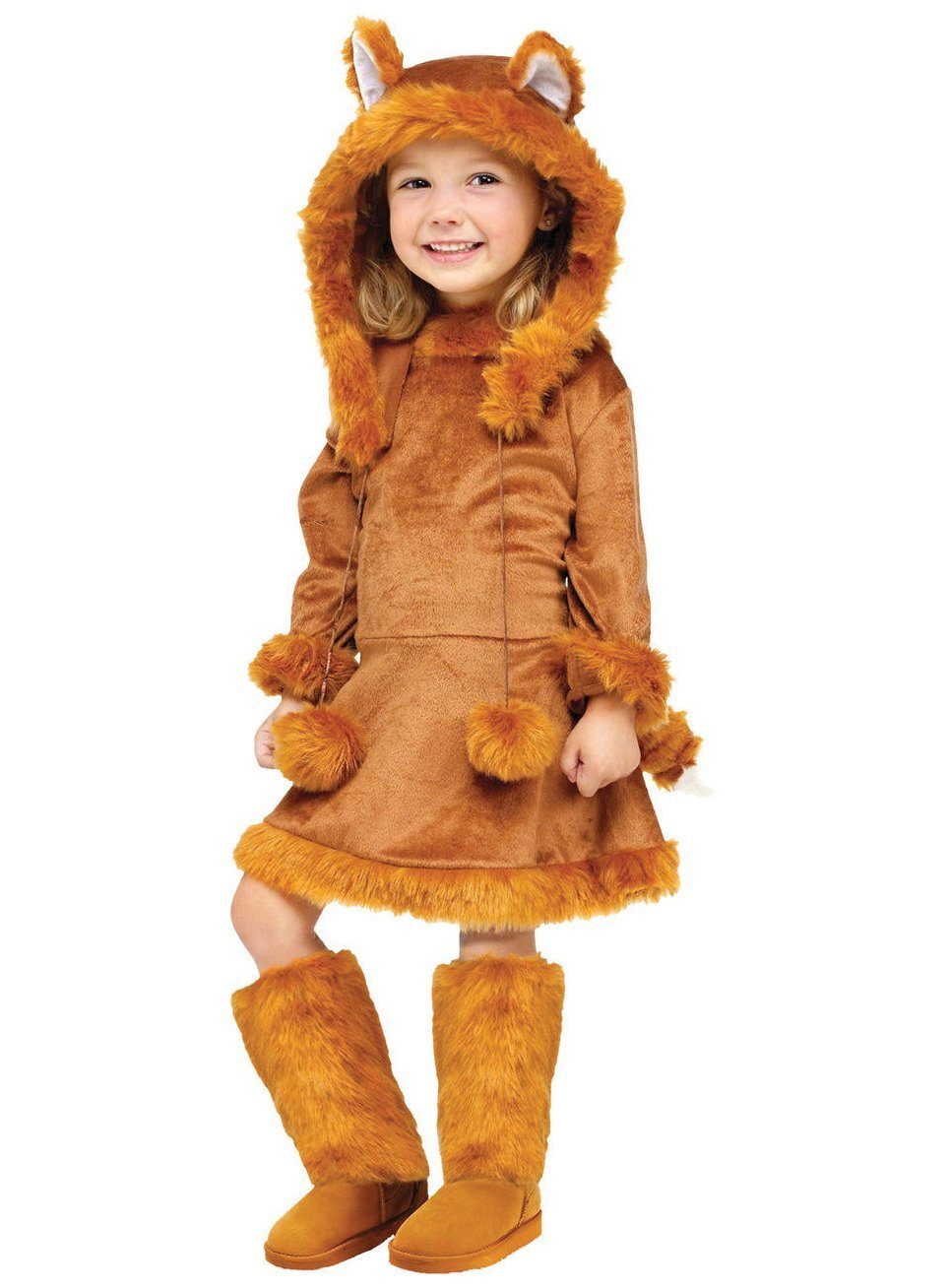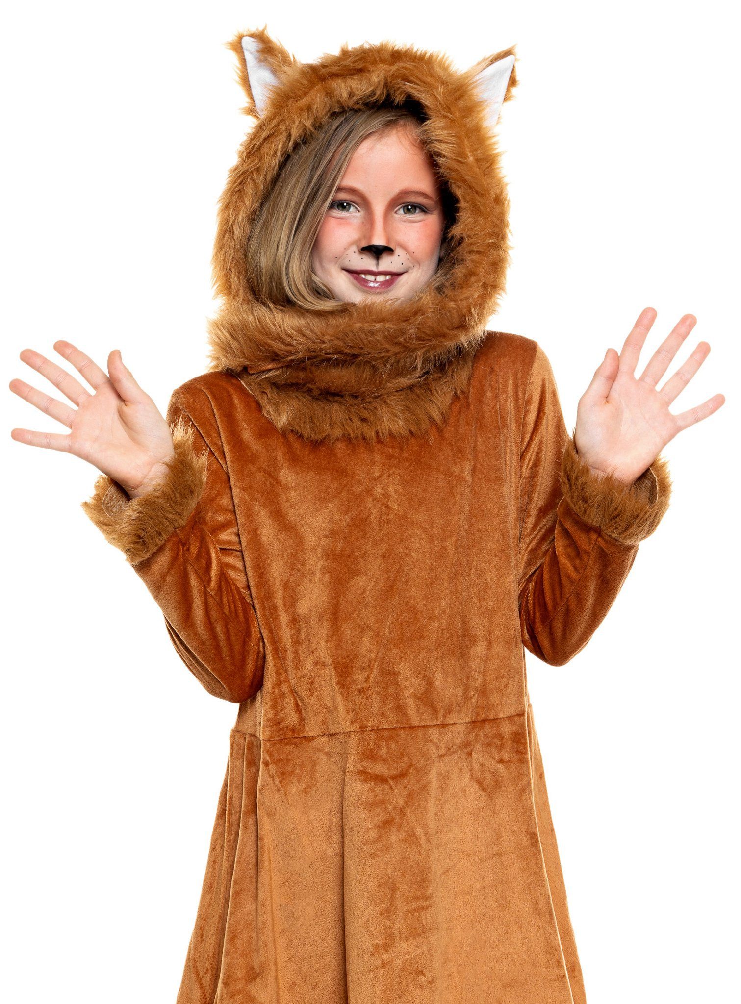 Cute fox costume for little girls! Five-piece children’s costume made of fluffy material, with faux fur trim, including dress, hat, fox tail and fur leg warmers!“Fox, you stole the goose…” Children love this song and will feel right at home in this adorable fox costume! The costume is made from a fluffy, soft, yet durable material. The cute dress is decorated with cuddly faux fur at the collar, cuffs, and waistband. It features a practical Velcro closure at the neck and a discreet loop at the lower back for attaching the bushy fox tail. The cute hat is also trimmed with soft faux fur and looks simply adorable with its sewn-on fox ears and fur pom-pom! The jaunty fur leg warmers with elastic at the knees can be easily worn over shoes, completing this adorable fox costume!