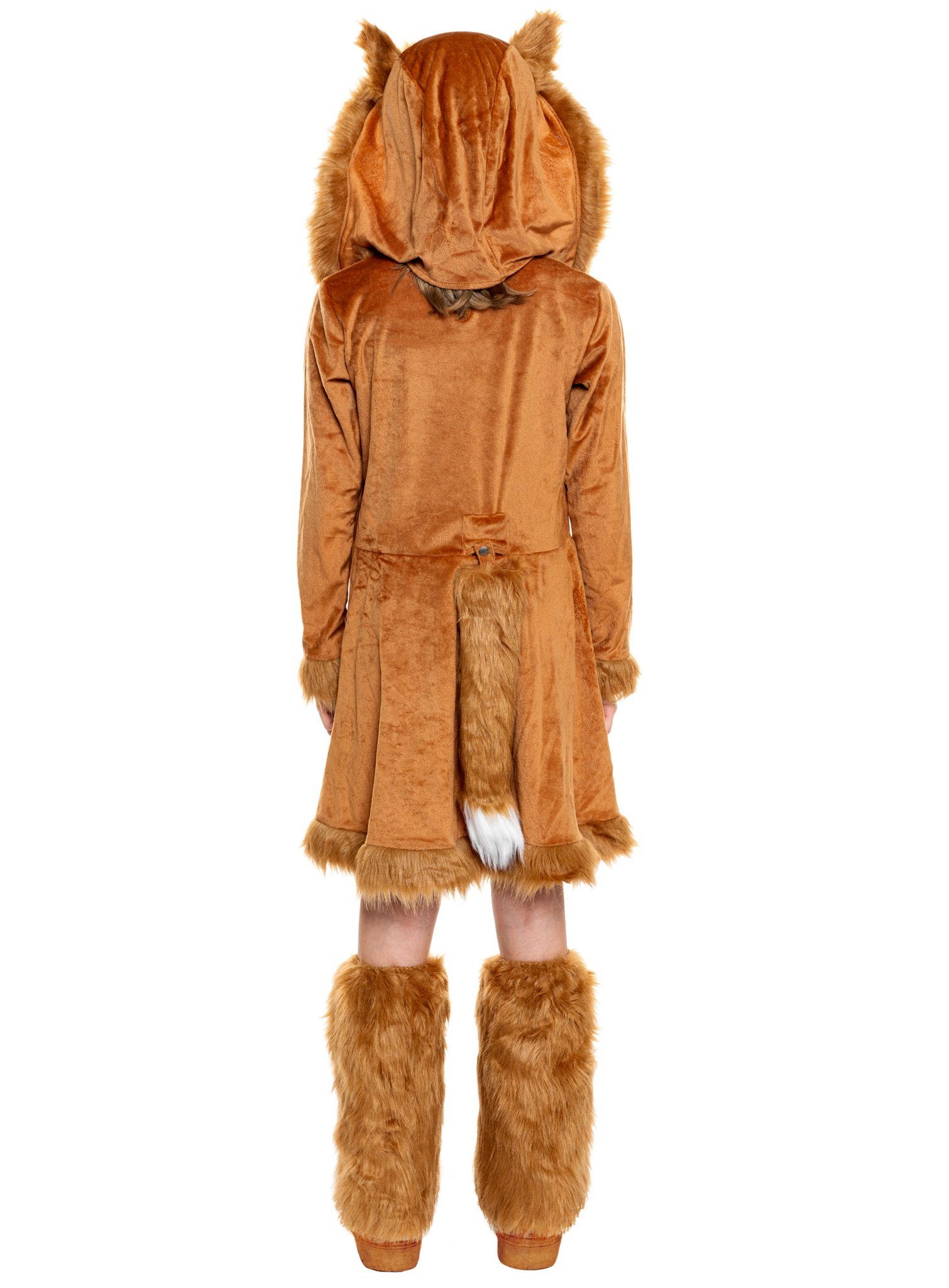 Features – Fox children’s costume – with dress – with fox tail – with fur hat – with a pair of fur leg warmers – without shoes or other accessories
