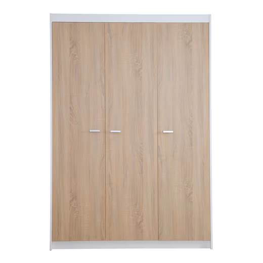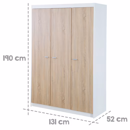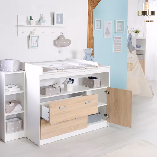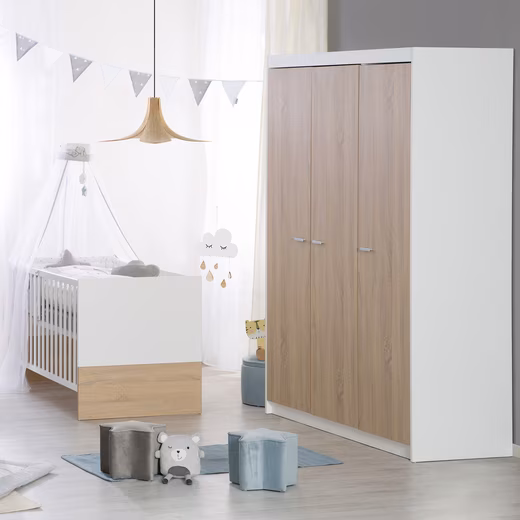 The roba “Gabriella” children’s room set combines timeless design, thoughtful functionality, and top quality – perfect for a lovingly furnished baby and child’s room. The three-piece set consists of a convertible crib (70 x 140 cm), a changing unit with three spacious drawers, and a generous three-door wardrobe. The crib grows with your child: thanks to separately available conversion sides, it can easily be transformed into a junior bed and will accompany your child for many years. The TÜV-certified bed ensures safety and security in every stage of development. The changing unit features a back-friendly changing height of 90 cm and a removable changing top. This allows it to be transformed into a practical chest of drawers in no time, offering valuable storage space even after the diaper-changing stage. Three smooth-running drawers provide organization and space for diapers, clothes, and care items. The chest of drawers measures (H x W): 98 x 88 cm, depth with/without changing top: 75/39 cm. The 3-door wardrobe, with its well-designed layout – including a clothes rail and 6 shelves – offers ample space for clothing, toys, and accessories. Measuring 190.5 x 131 x 52 cm (H x W x D), it blends harmoniously into any child’s room, providing organization and a sense of order. The “Gabriella” series impresses visually with its modern two-tone design in white and light, rough-sawn Sonoma oak. The combination of clean lines, warm wood tones, and an easy-care, durable resin coating makes the furniture particularly long-lasting and suitable for everyday use – ideal for stylish family life. The “Gabriella” children’s furniture range was developed in Germany according to the latest safety standards. It combines quality, safety, and modern design into a stylish overall look that delights both parents and children.