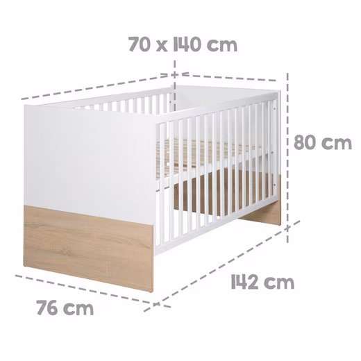 • The TÜV-certified, 3-way height-adjustable roba baby bed (70 x 140 cm) can be converted into a junior bed for the children’s room.
