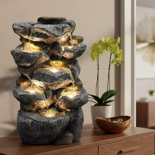 Fountain BK802 with LED Lighting. This meticulously crafted waterfall is a highlight in any setting. The integrated pump draws water into the top basin, from where it cascades over the edges into the lower basins, creating a beautiful water feature. Made of robust and weatherproof artificial stone, it is extremely easy to care for. Suitable for both indoor and outdoor use! LED Lighting: The fountain features six warm white LEDs that create a harmonious lighting effect after dark! Specifications and Dimensions: Height: approx. 48.5 cm / Width: approx. 31 cm / Depth: approx. 24 cm Weight: approx. 4.5 kg Material: Polyresin Ready to use! Simply fill with water and you’re done! This offer includes all necessary accessories: – LED lighting (6x, pre-assembled) – Water pump (approx. 1.80m cable) – IP44 power supply (suitable for outdoor use) – Instructions. Please note that slight color variations may occur compared to the photos/videos due to different lighting conditions.