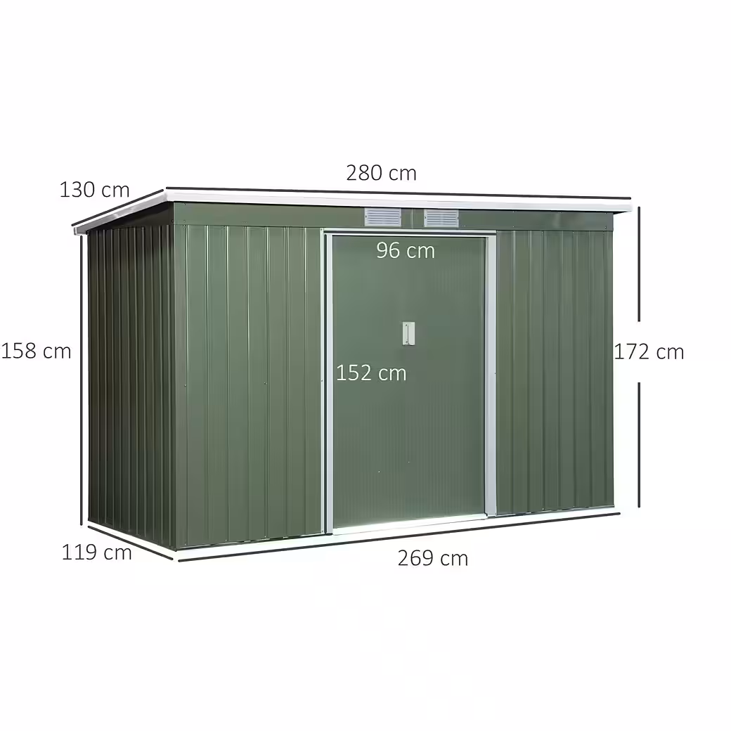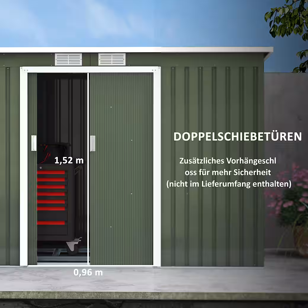 Whether sun, rain, or snow, our garden shed is the perfect storage place for all your gardening tools. From lawnmowers to pool accessories, everything is protected in this garden shed. The pent roof made of robust galvanized sheet steel protects your equipment from all weather conditions. The wide sliding doors offer easy access and a clear view of your tools and equipment. And thanks to the ventilation grilles, the garden shed is always well-ventilated. So get out into the garden!