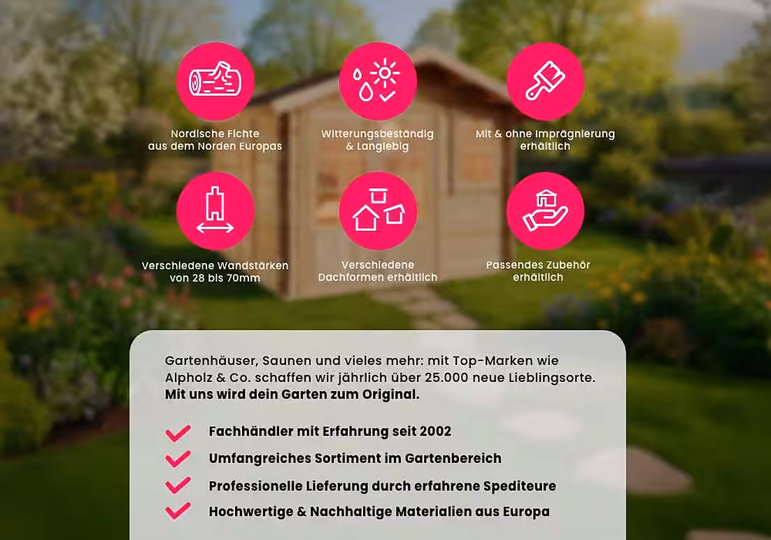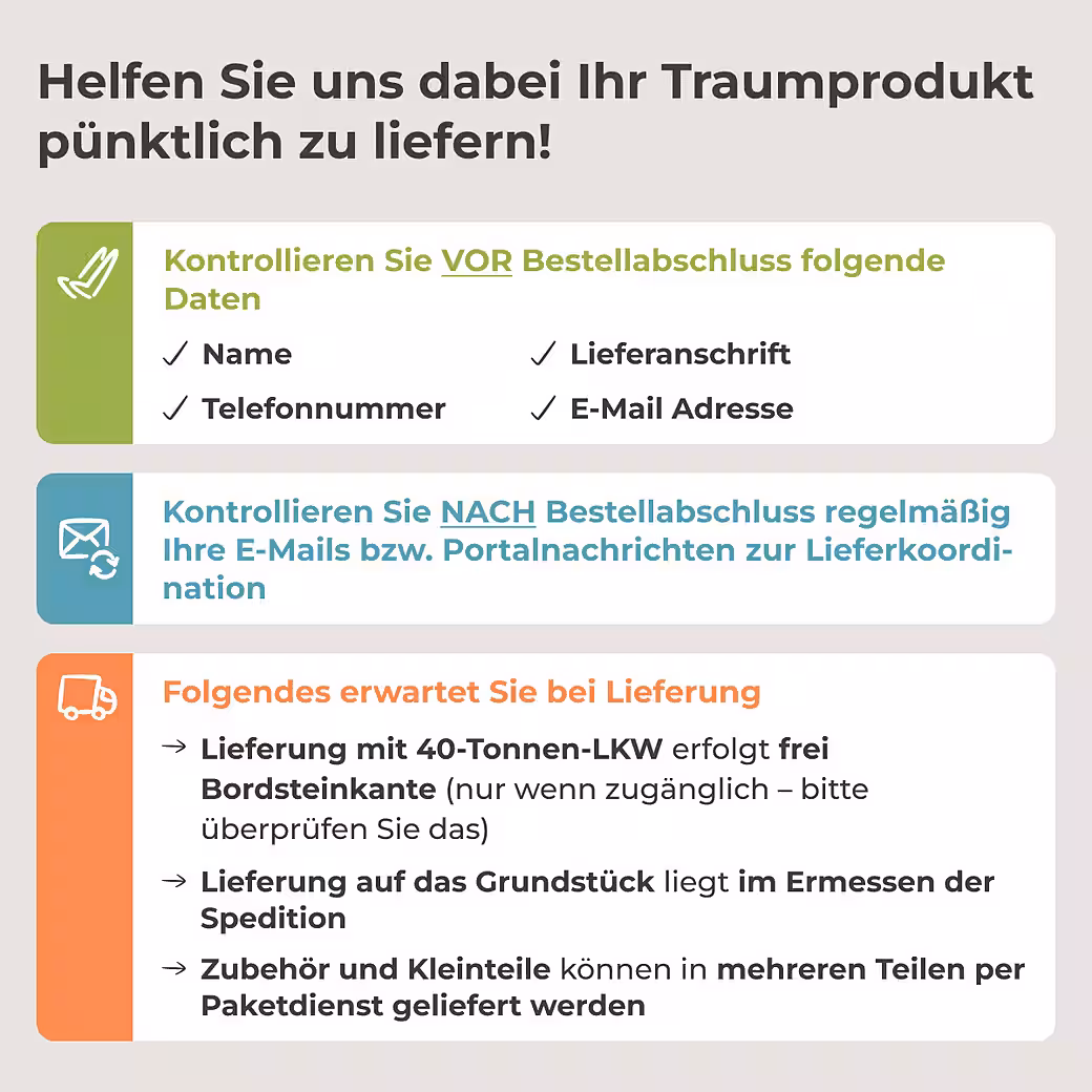 With an impressive footprint of 23.52 m² and a volume of approximately 65.8 m³, it offers ample space for your ideas. The robust 44 mm wall thickness ensures excellent stability, optimal protection in all weather conditions, and lasting quality.