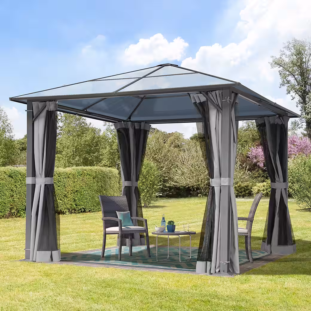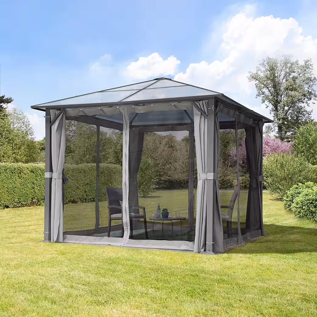 • Thanks to the combination of a hardtop roof and powder-coated metal, this garden pavilion can be used all year round. Side panels and mosquito nets are included.