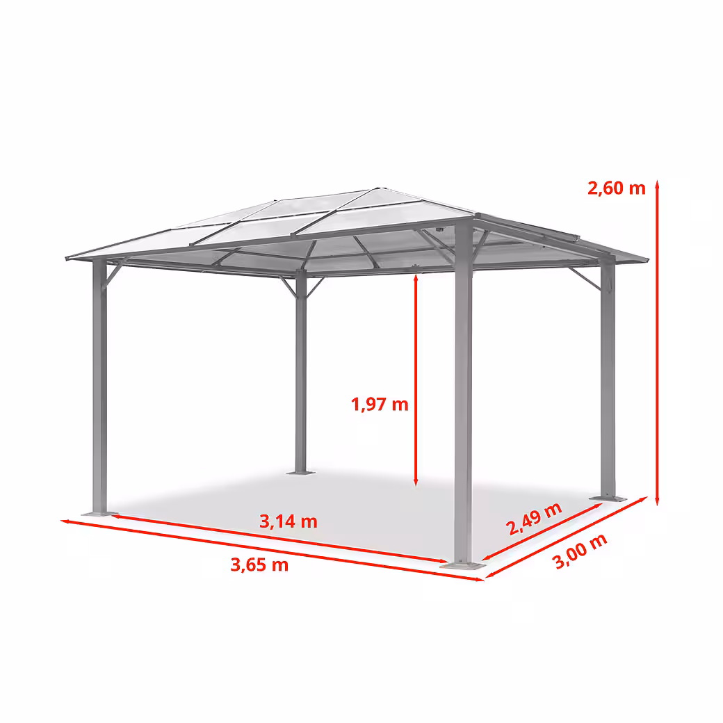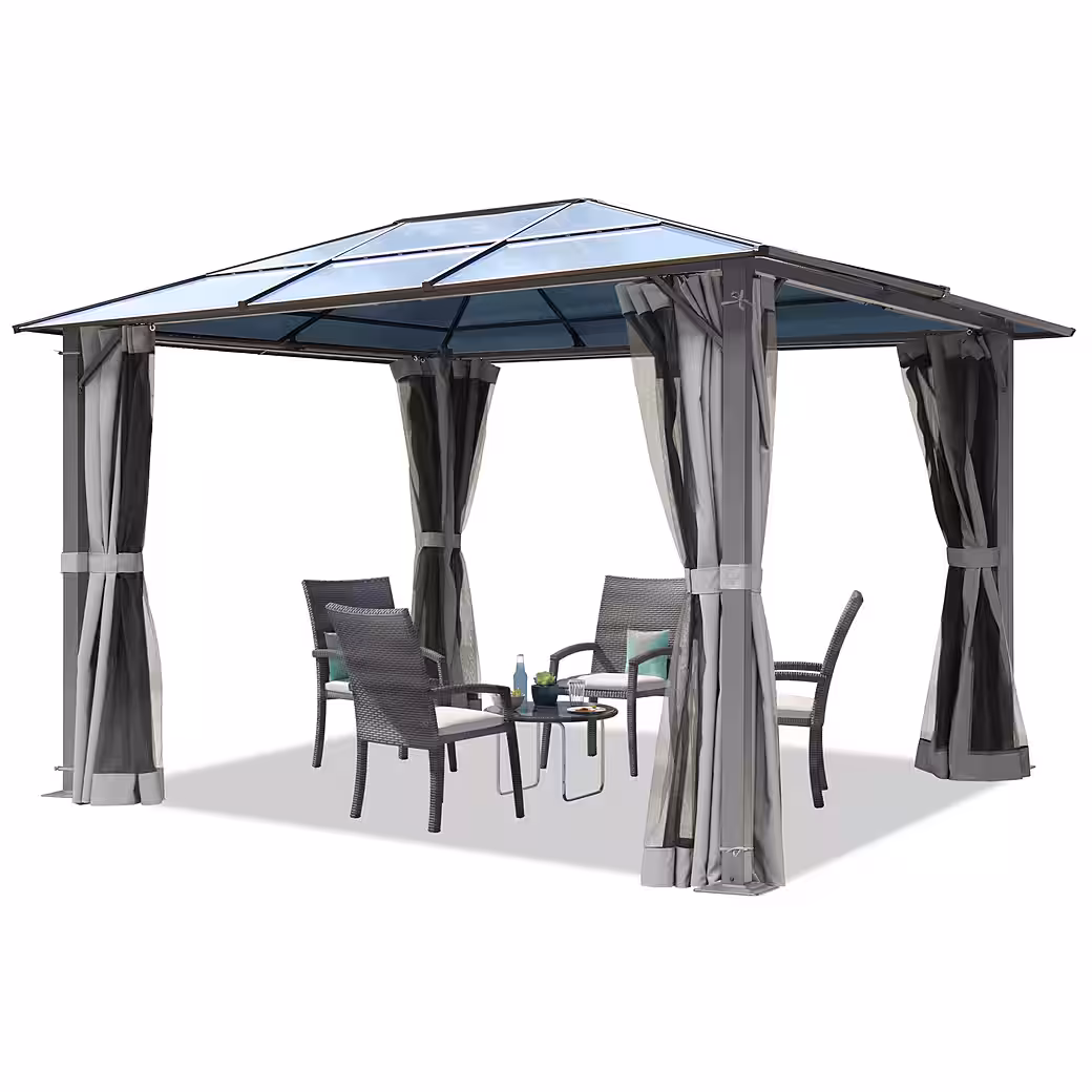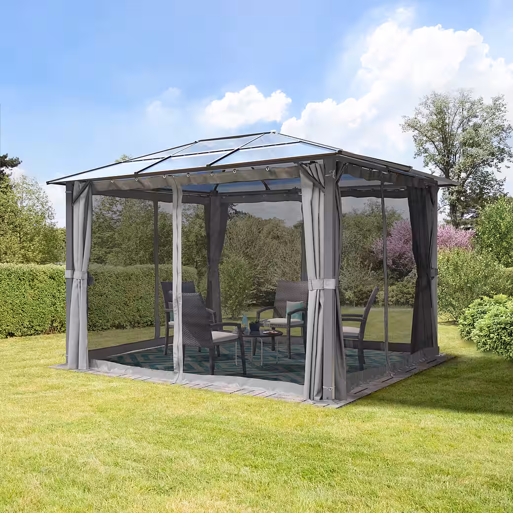 - Thanks to the combination of a hardtop roof and powder-coated metal, this garden pavilion can be used all year round. Side panels and mosquito nets are included.