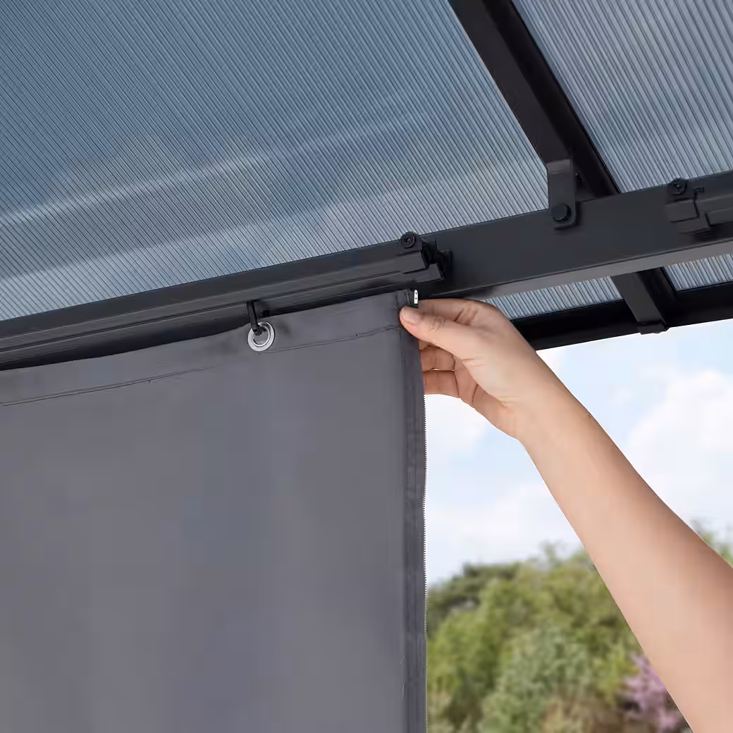 - EVERYTHING INCLUDED: Aluminum roof struts, steel posts, polycarbonate roof panels, 4 side panels & 4 mosquito nets including mounting hardware, 8 concrete anchors, assembly instructions