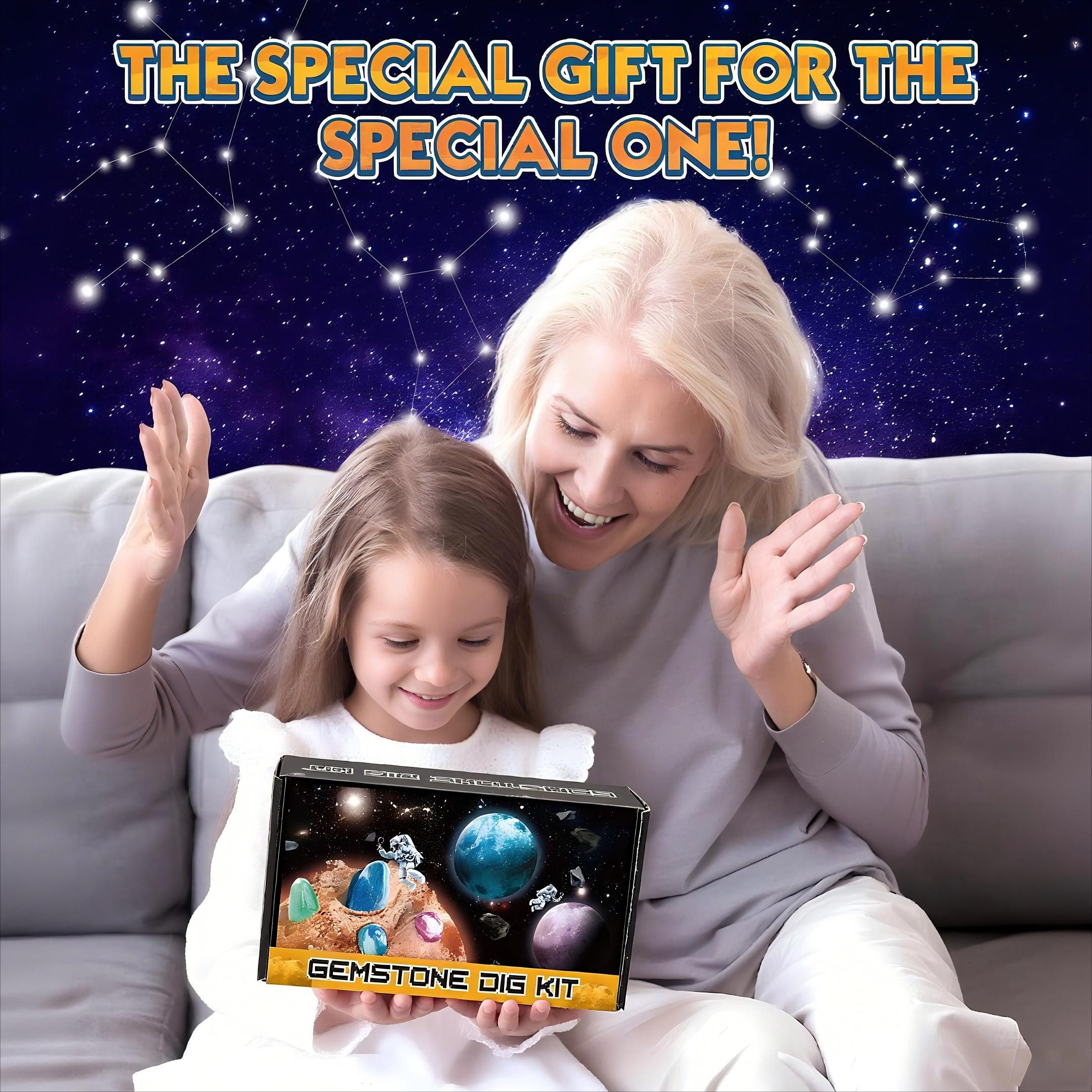 15 Gemstones to Dig For:Â Three exquisite spheres represent the mysterious planets of the solar system. Each contains valuable gemstones waiting to be discovered by little explorers. This craft kit for children aged 6 and up is entertaining and educational. You can dig up opals, topaz, turquoise, amethysts, aventurine, and more, finding your own lucky stones.
