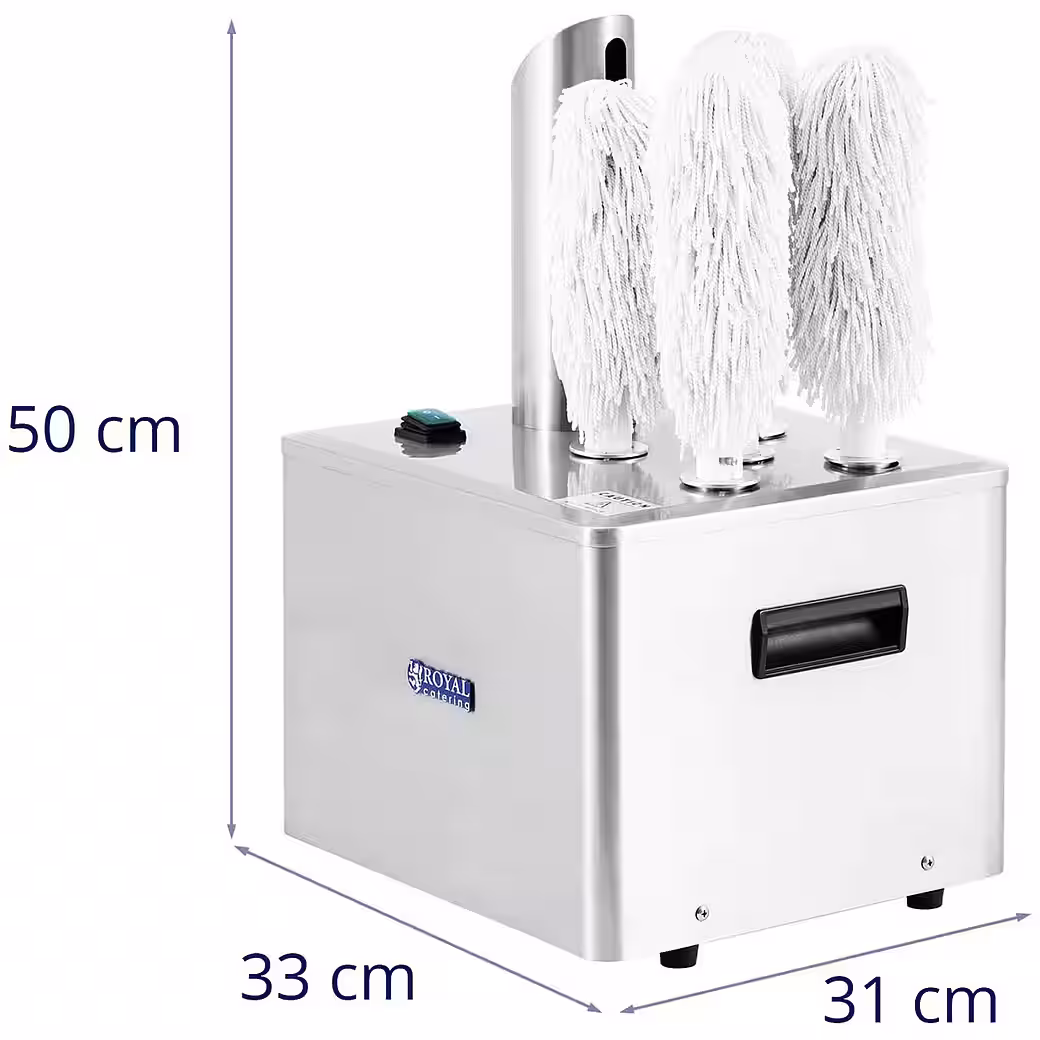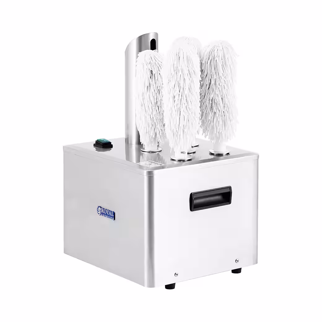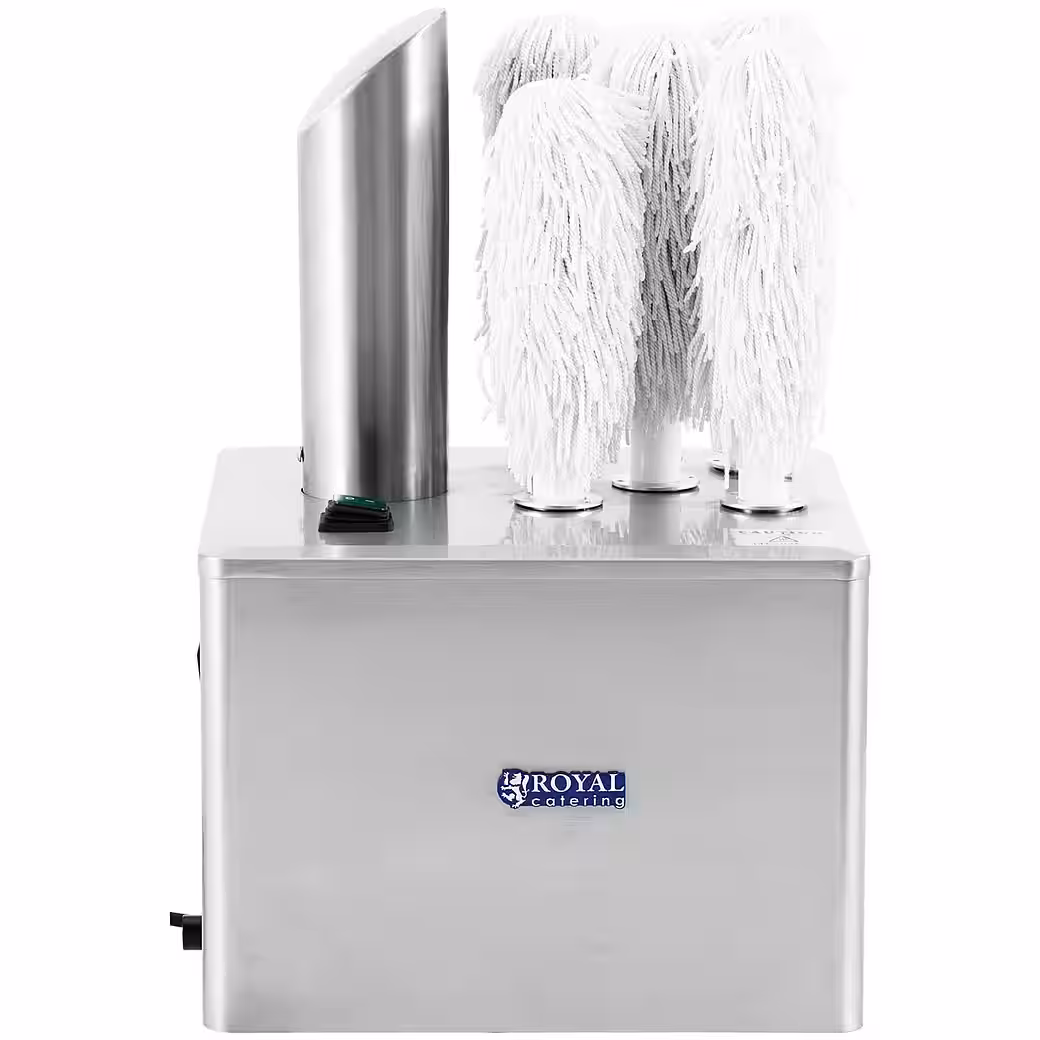The Royal Catering electric glass polishing machine polishes all types of glassware to a high shine in just a few moments. Five microfiber polishing heads achieve flawless results on any shape and size, polishing up to 330 glasses per hour. This professional glass polisher provides enormous time and effort savings for hotels, restaurants, bars, catering companies, and anywhere perfect glassware is essential.